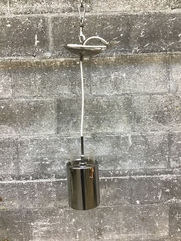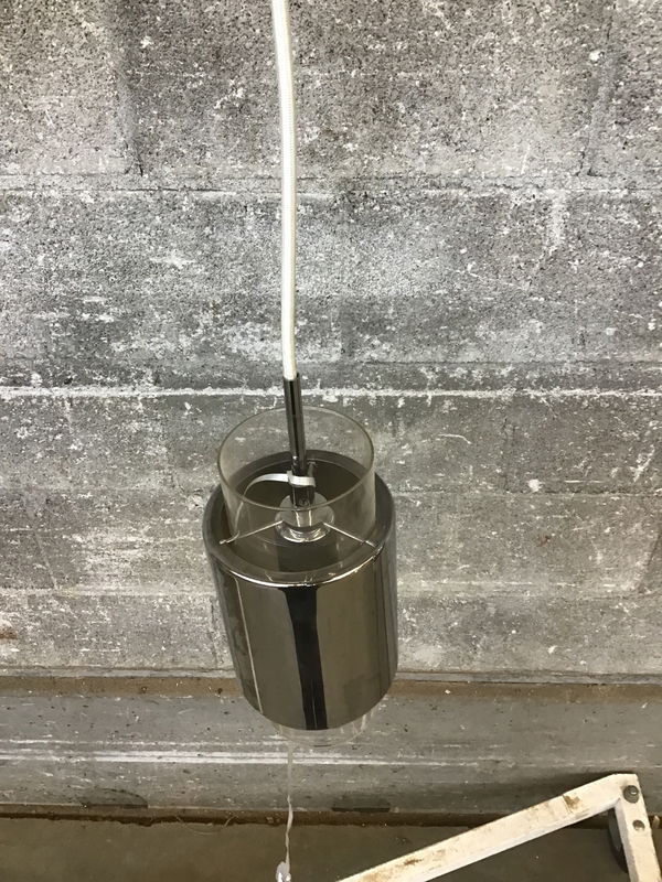 A clear cylinder inside of a mirrored glass cylinder hangs from 2.5' of adjustable rayon covered wire on this sweet pendant light. Restored in-house