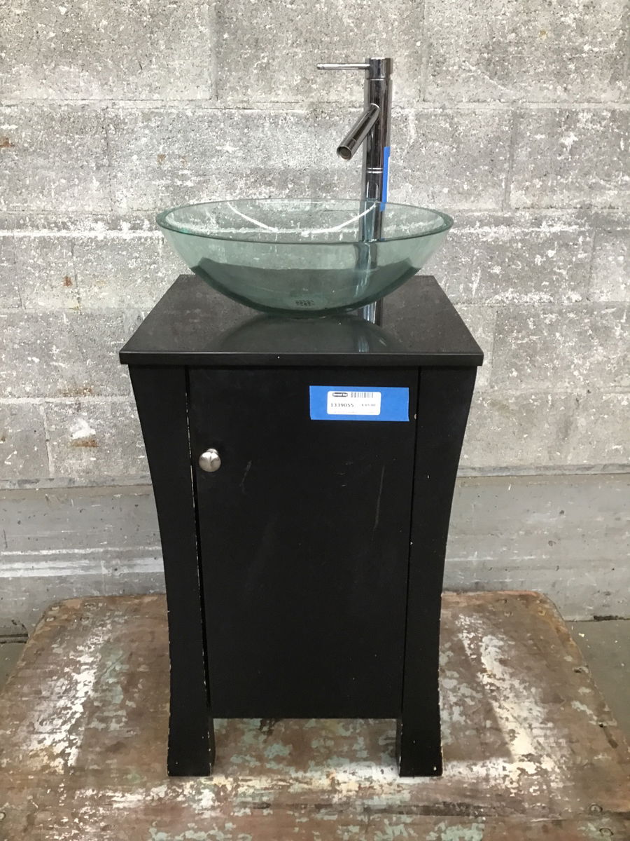 Compact modern vanity cabinet with clear glass vessel sink(this has one teeeeny chip on the side) and chrome faucet. Perfect in that smaller bathroom!