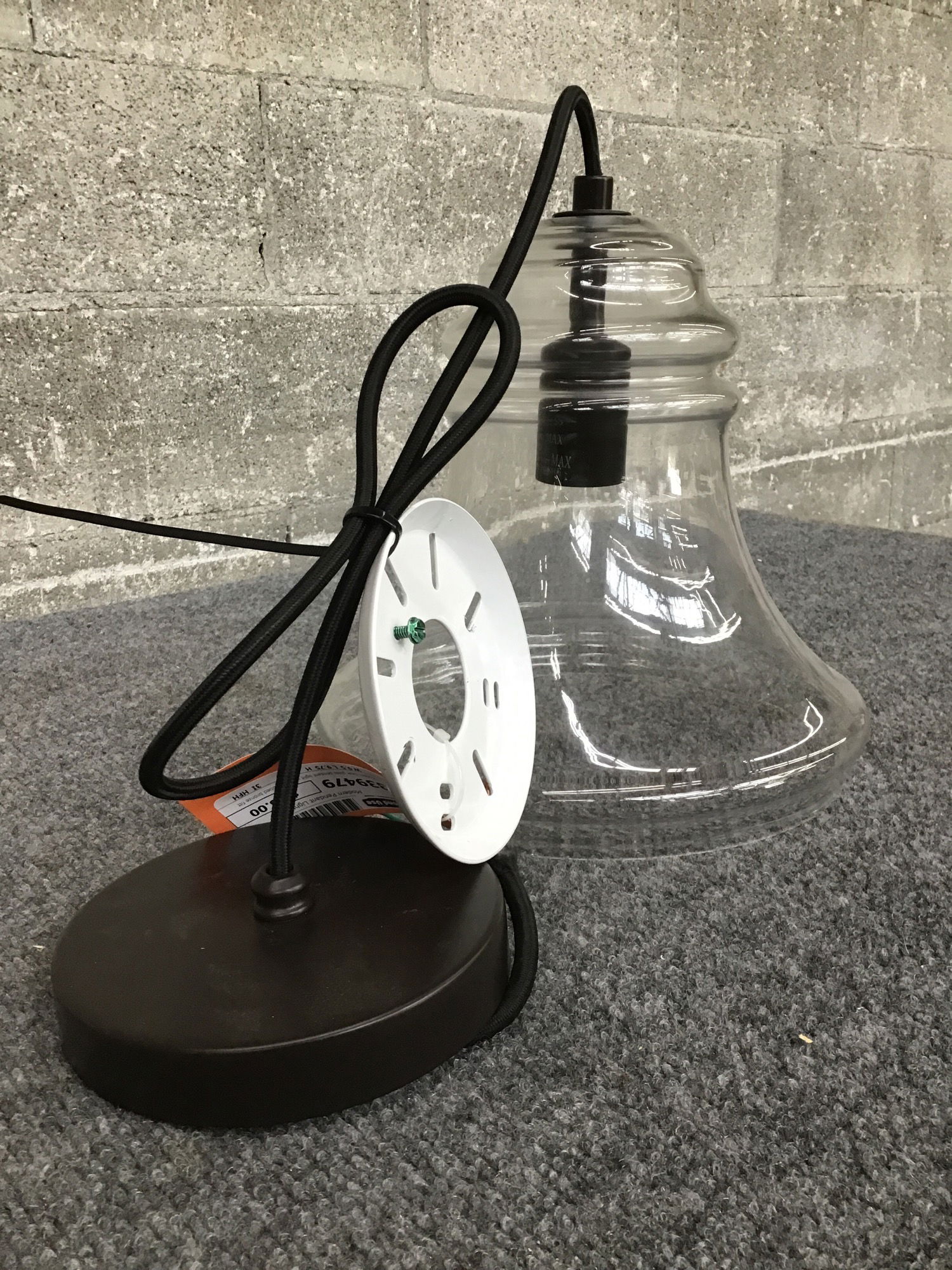 Modern clear glass pendant light with oil rubbed bronze fitter. Made by Sea Gull. Suitable for damp locations. Photo may be representational.