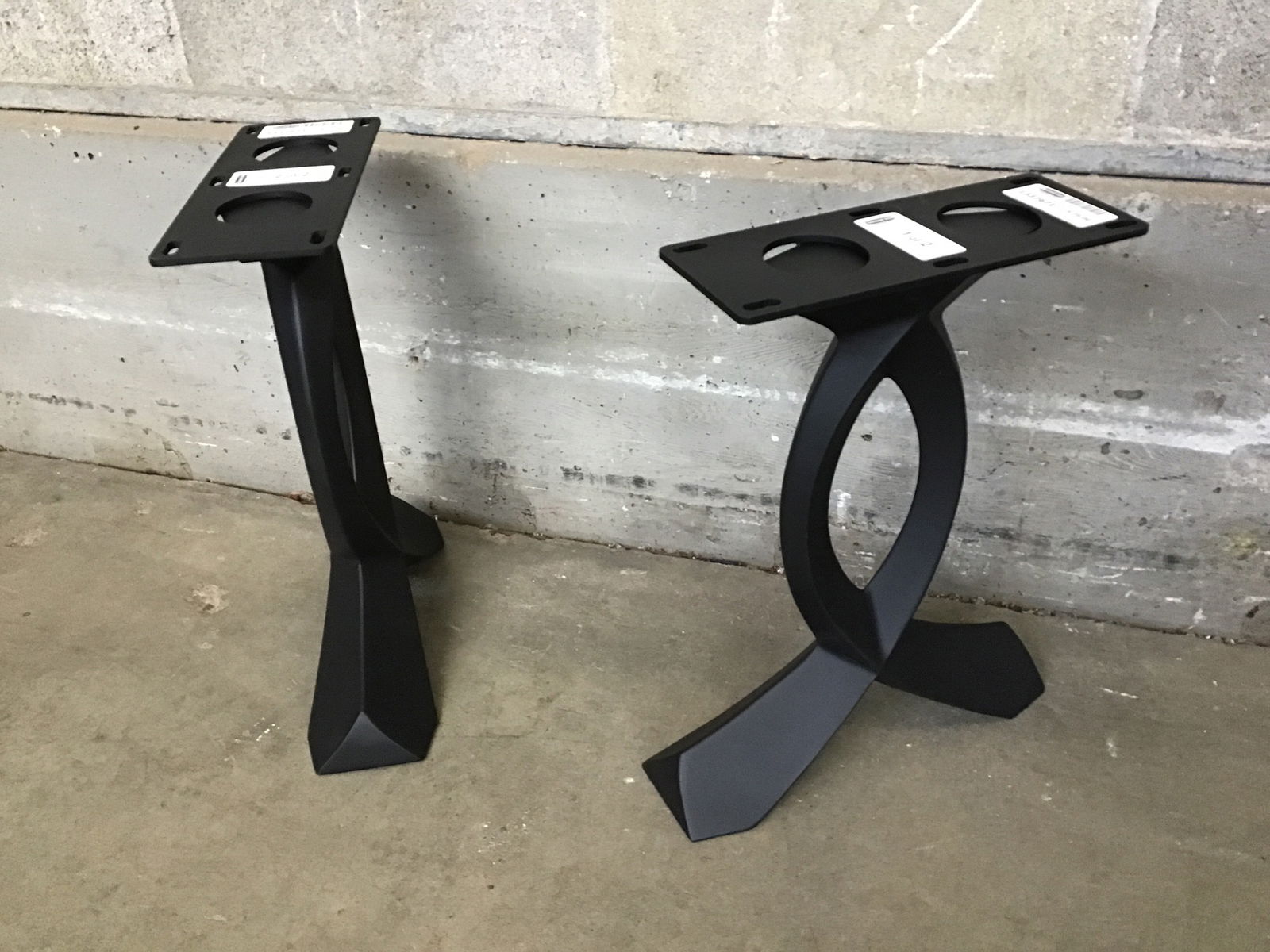 This is a pair of modern curved metal bench legs from FlowyLine. They have a clean black powder coated finish and have 6 holes each for mounting.