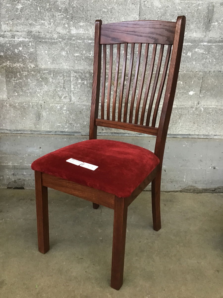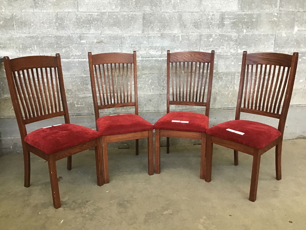 Set of four solid wood chairs with upholstered velvety seats, sold as a set of four.
