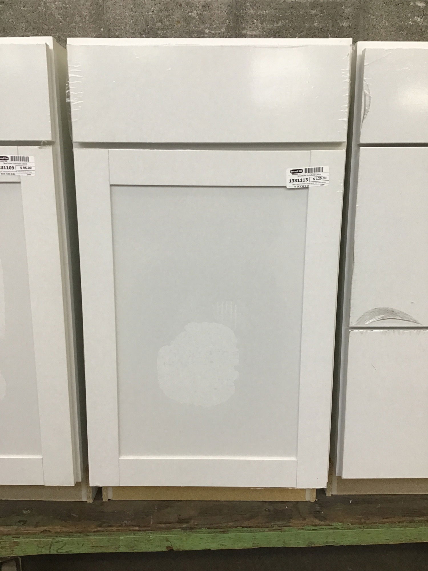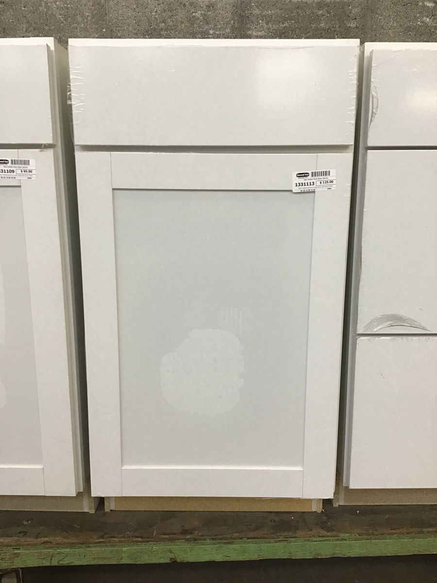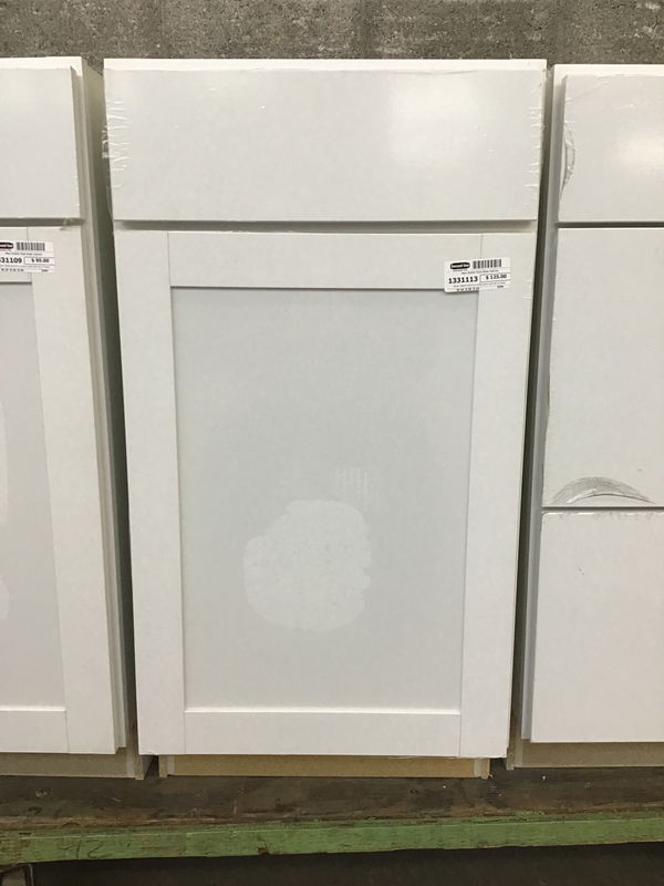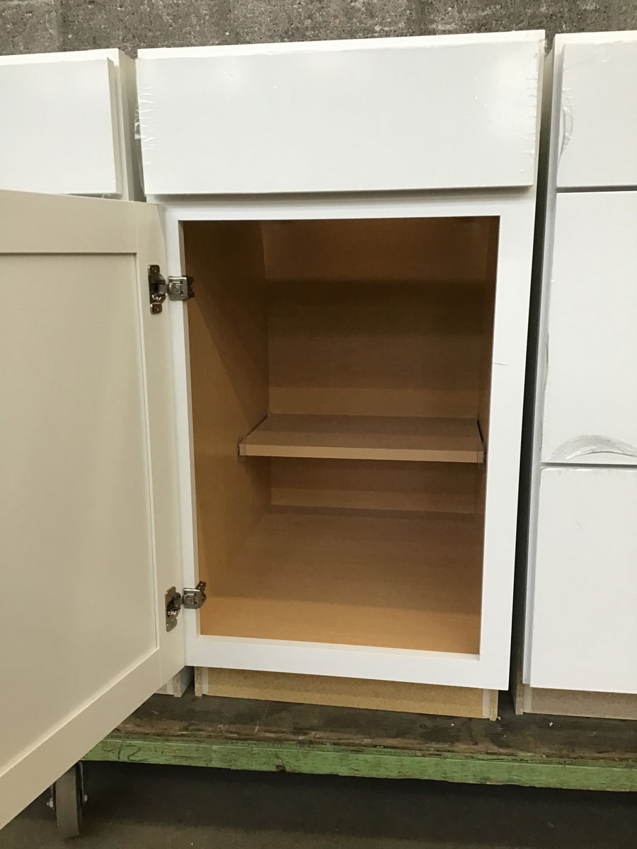Never installed solid face builder grade base cab w/ Shaker style door. Has an adjustable shelf inside. You get to peel the protective film off of the doors as a bonus!!