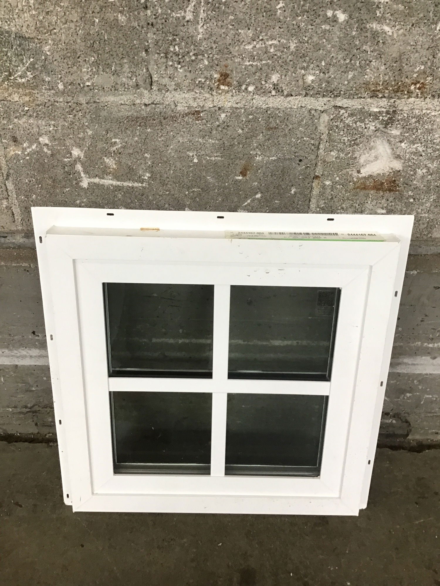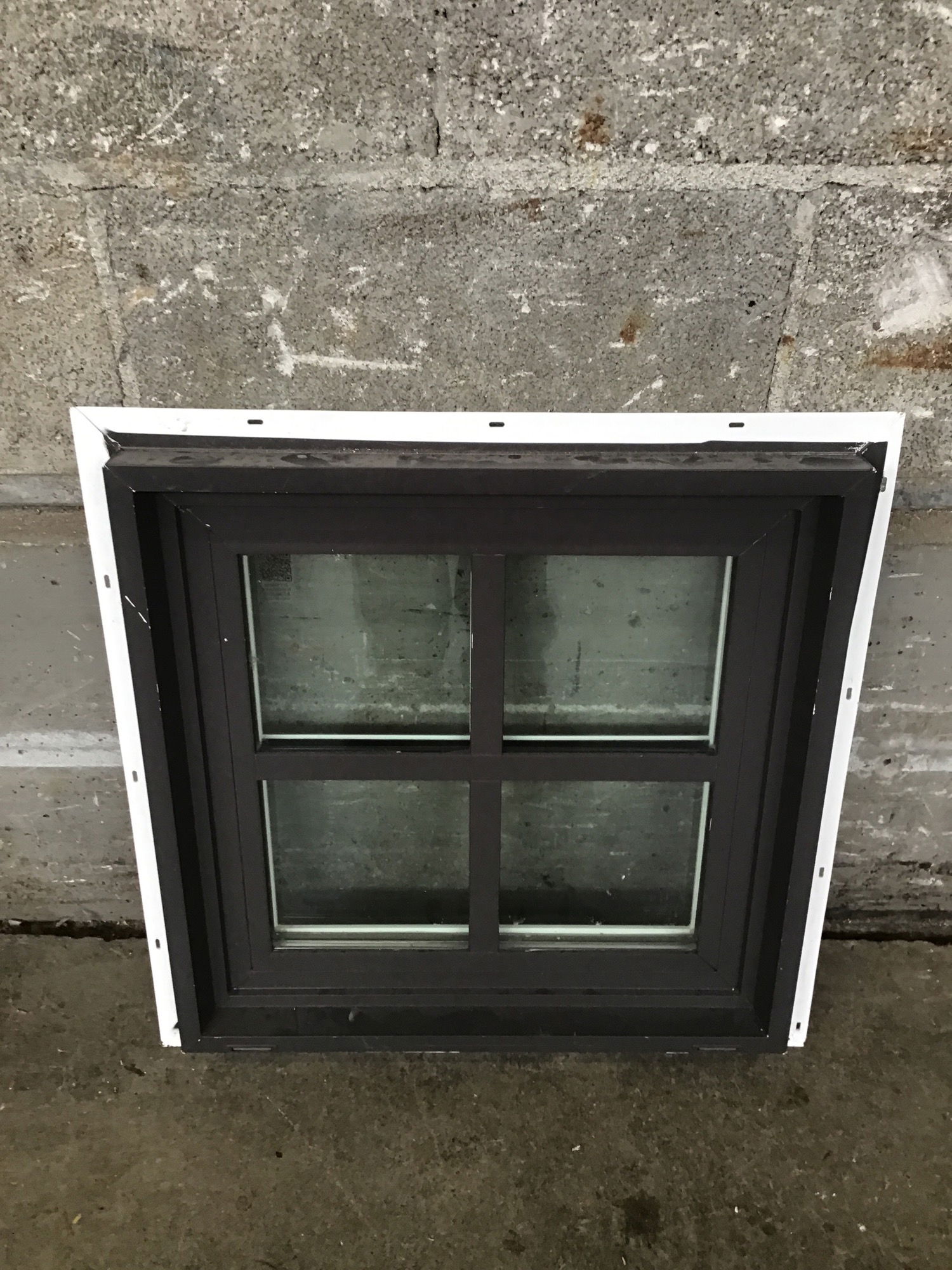 Teeny tiny 2019 vinyl window featuring faux divided mullions, a brown exterior and a white interior. This was previously a showroom display window and has never been installed.
