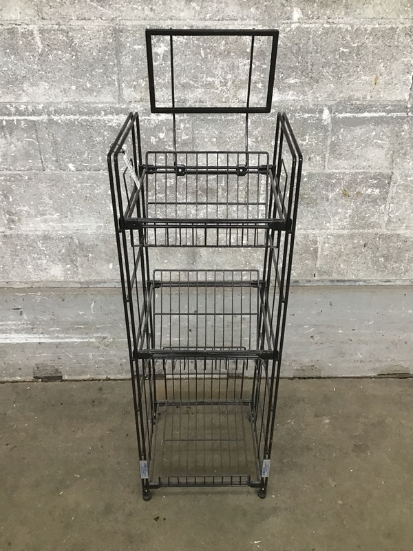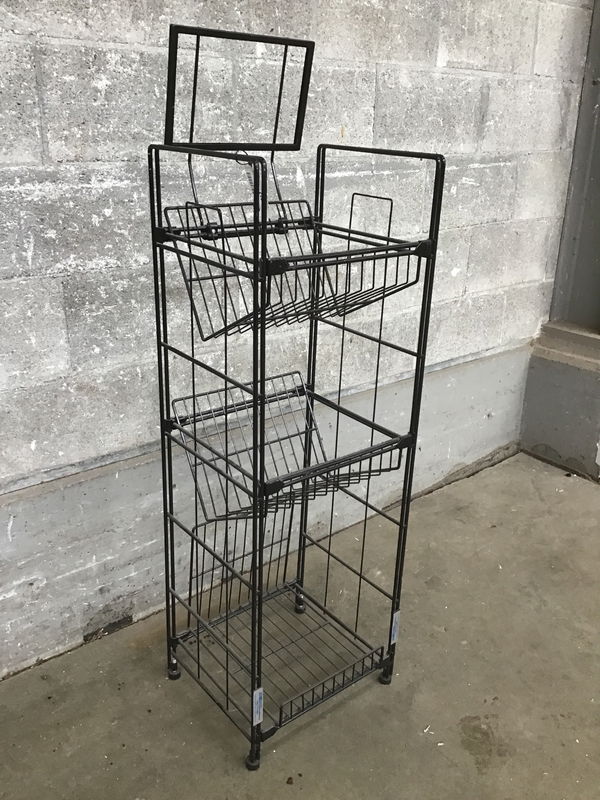 A black wire newspaper/tabloid stand with 3 tiers in great shape. Has a frame for branding display at the top! You could also use this to display records, books, or store your shoes by the door!