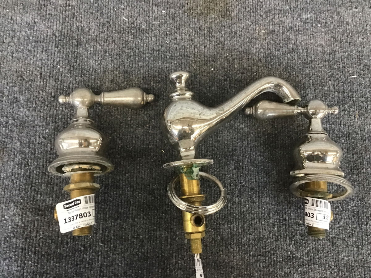 I can't find a name on this nickel finish, wide spread lav faucet, but it looks higher end. You will need some new flexible supply lines (looks like common 1/2" & 3/8" IP fittings, so it should be pretty easy to get them going). Price reflects they need the supply lines.