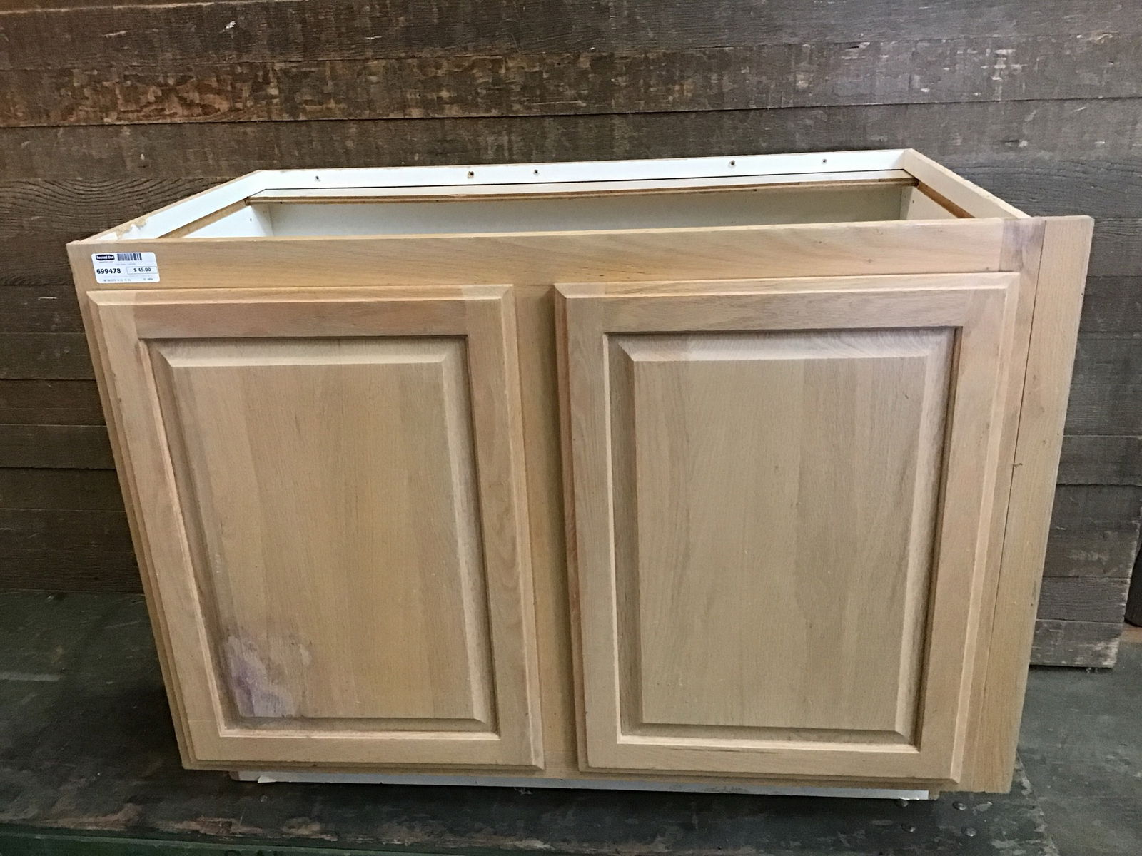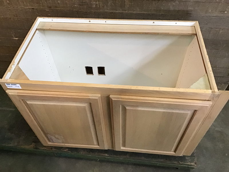 Oak base cabinet. Previously installed but in overall fair shape with visible damage to the left door. Price reflects condition.