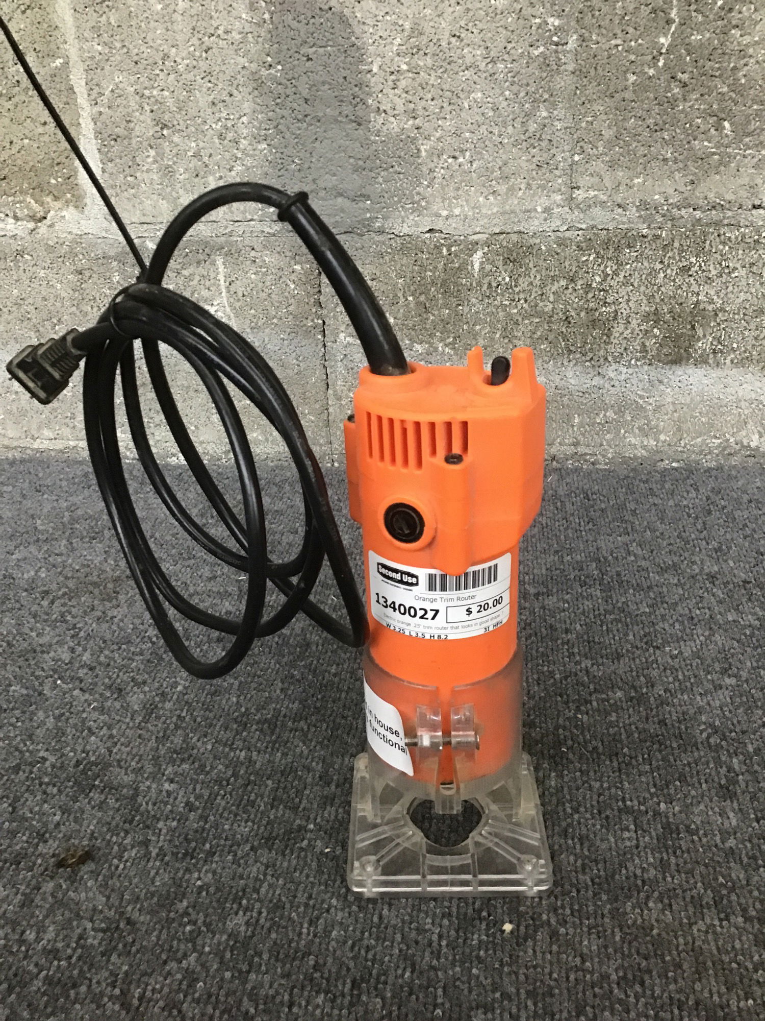 Electric orange .25" trim router that looks in good shape. Tested in house and seems very functional. Otherwise great if one is lost at sea trying to hail a ship!