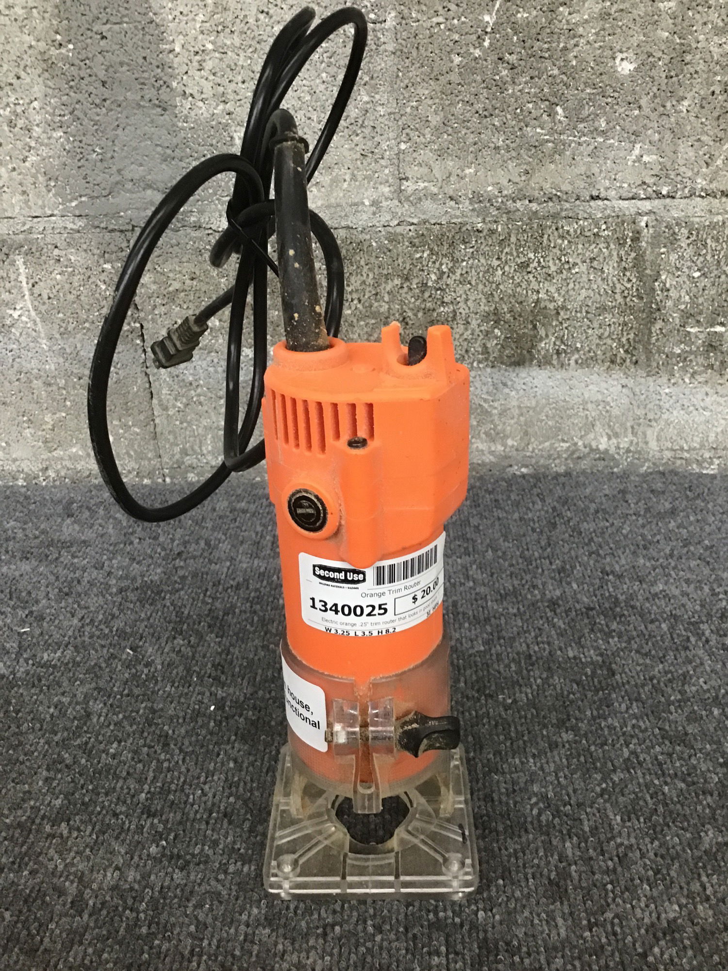 Electric orange .25" trim router that looks in good shape. Tested in house and seems very functional. Otherwise great if one is lost at sea trying to hail a ship!