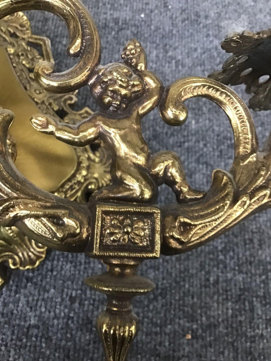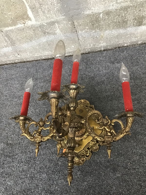 Intensely ornate single brass wall sconce with cherubs and red velvet candlesticks.
