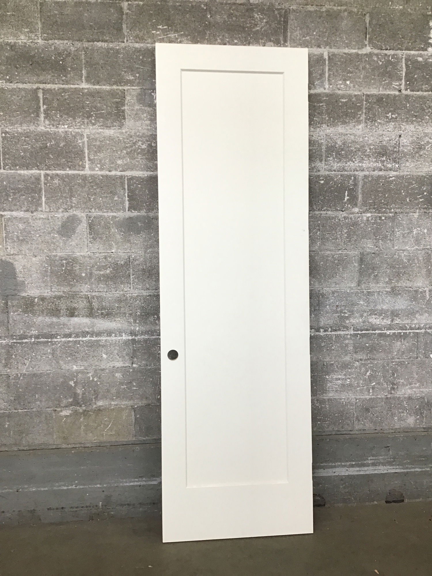 A very overheight single panel door that's got a white paint job and a hole bored for a knob.