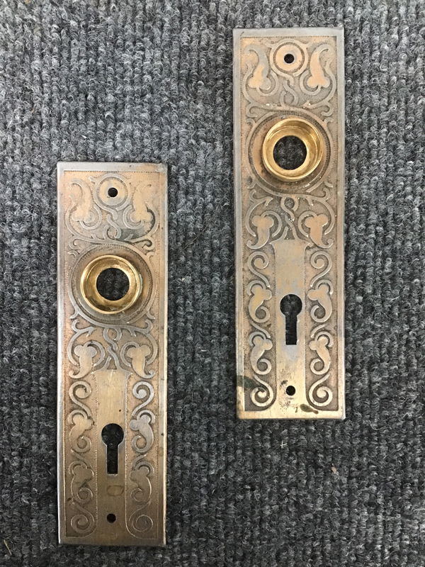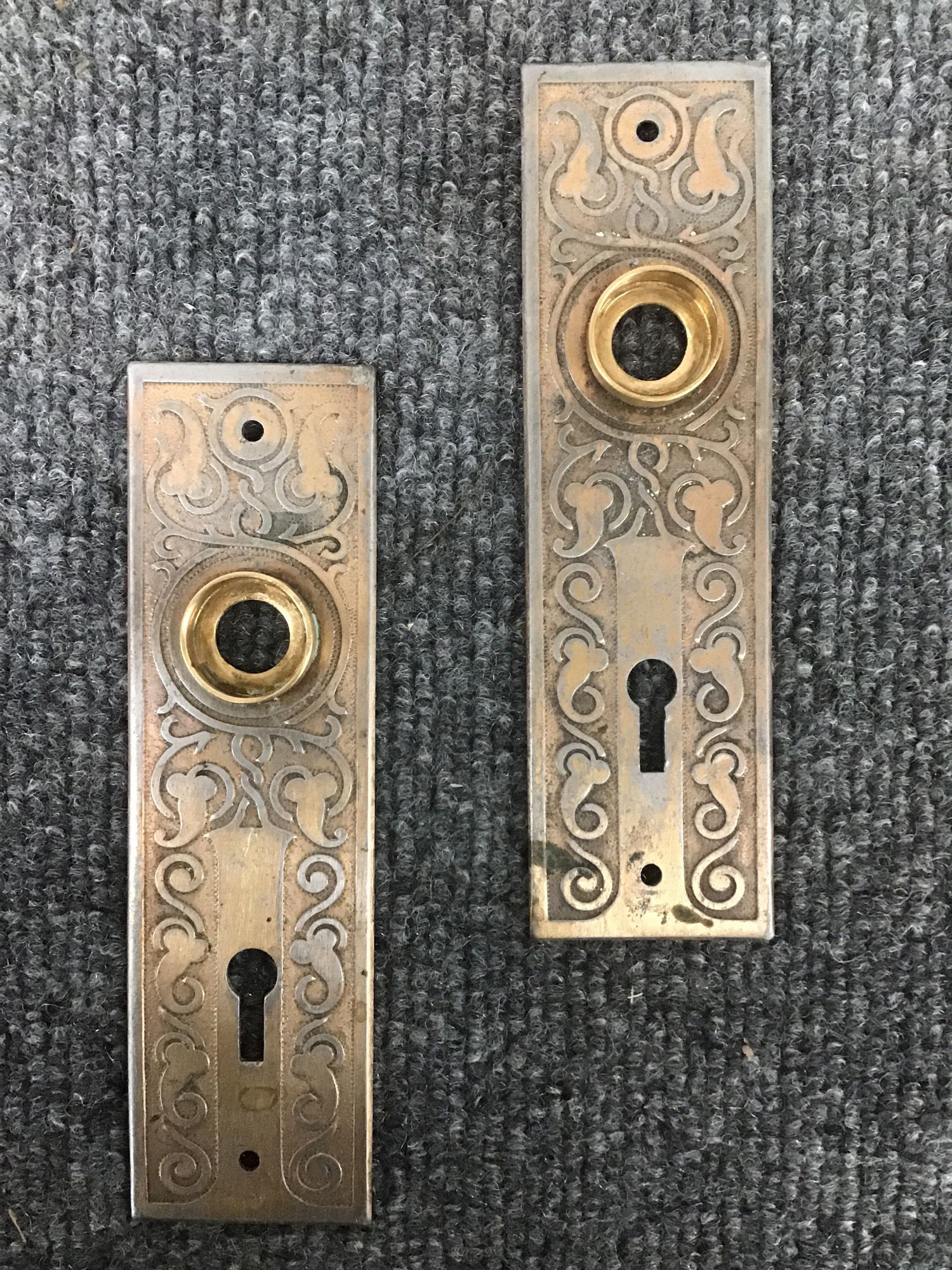 Pair of vintage, stamped steel, Eastlake escutcheons with signature floral/geometric design and an oxidized brass finish. This style of door hardware is becoming increasingly rare and sought after. Cleaned up in house.