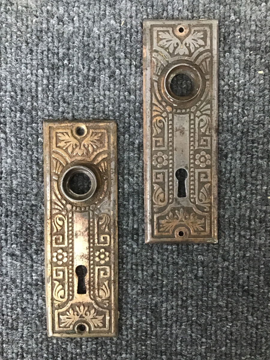 Pair of vintage, stamped steel, Eastlake escutcheons with signature floral/geometric design and an oxidized brass finish. This style of door hardware is becoming increasingly rare and sought after. Cleaned up in house.