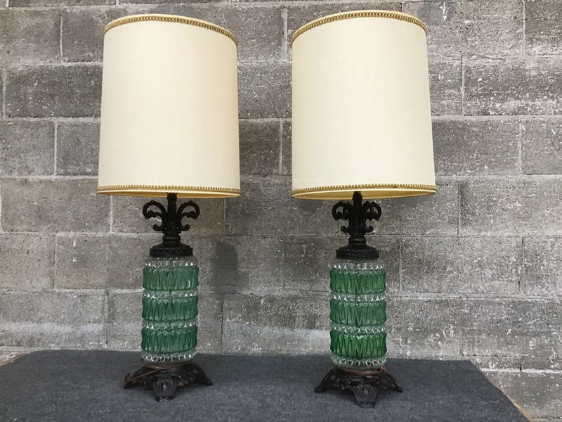 Sweet pair of lamps with midcentury vibes in a Hollywood Regency sort of way. Green and clear glass with black metal base. By EF-EF Industries.
