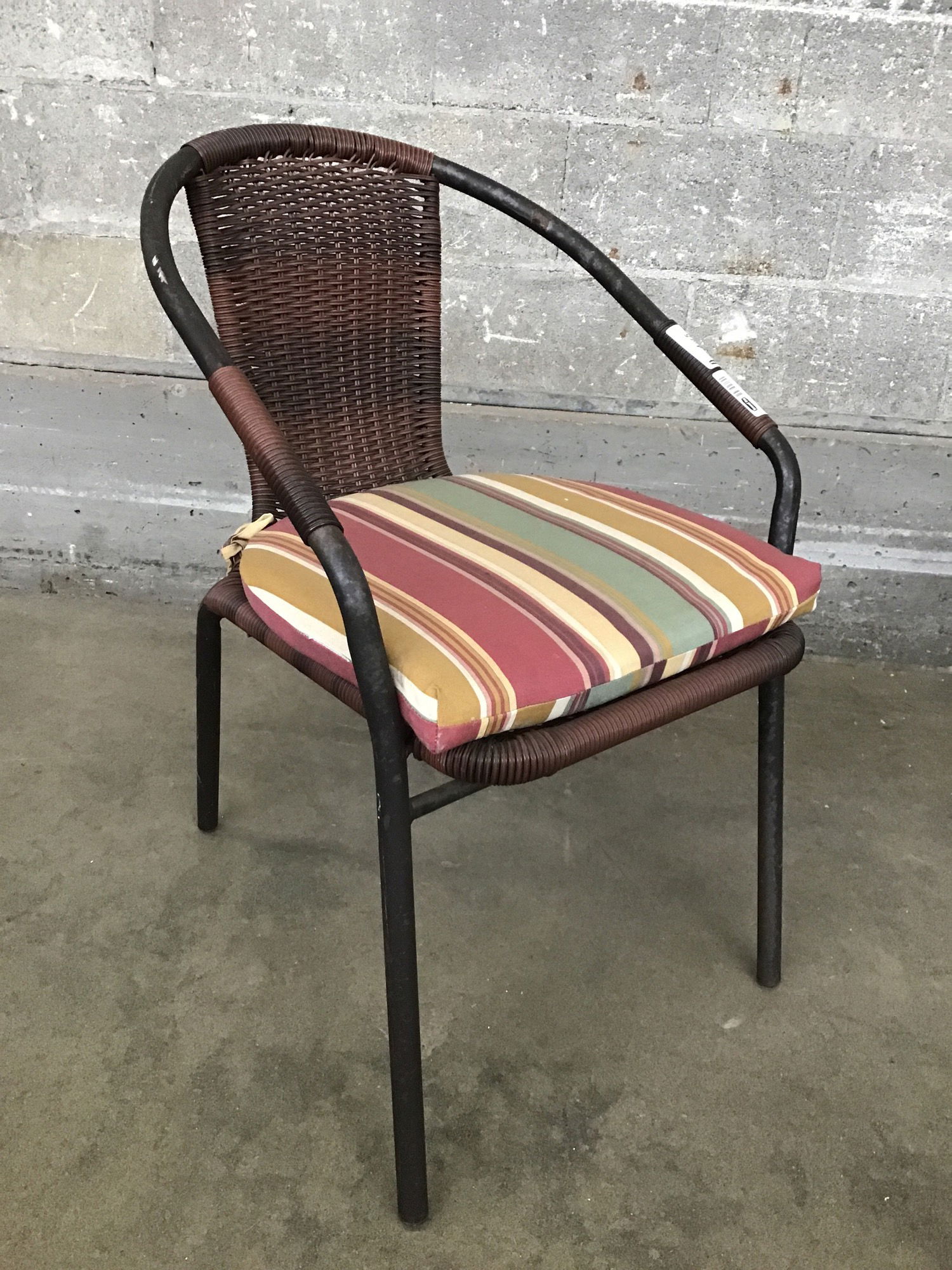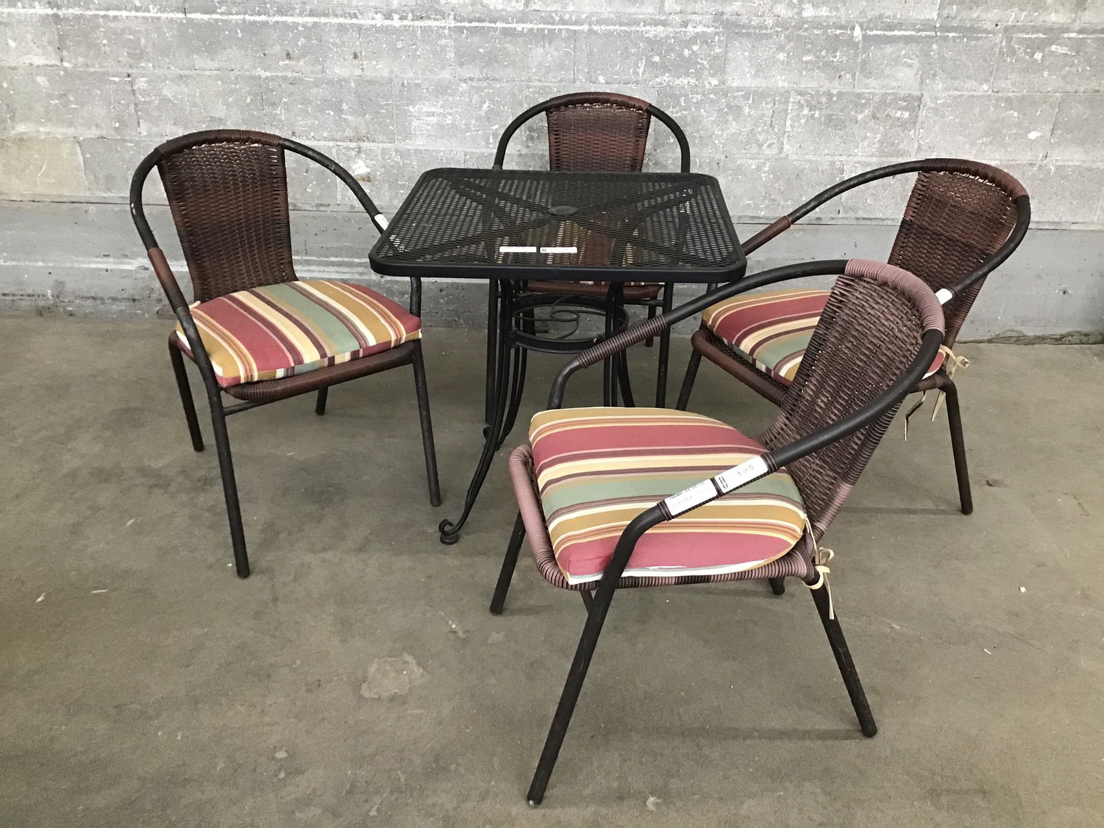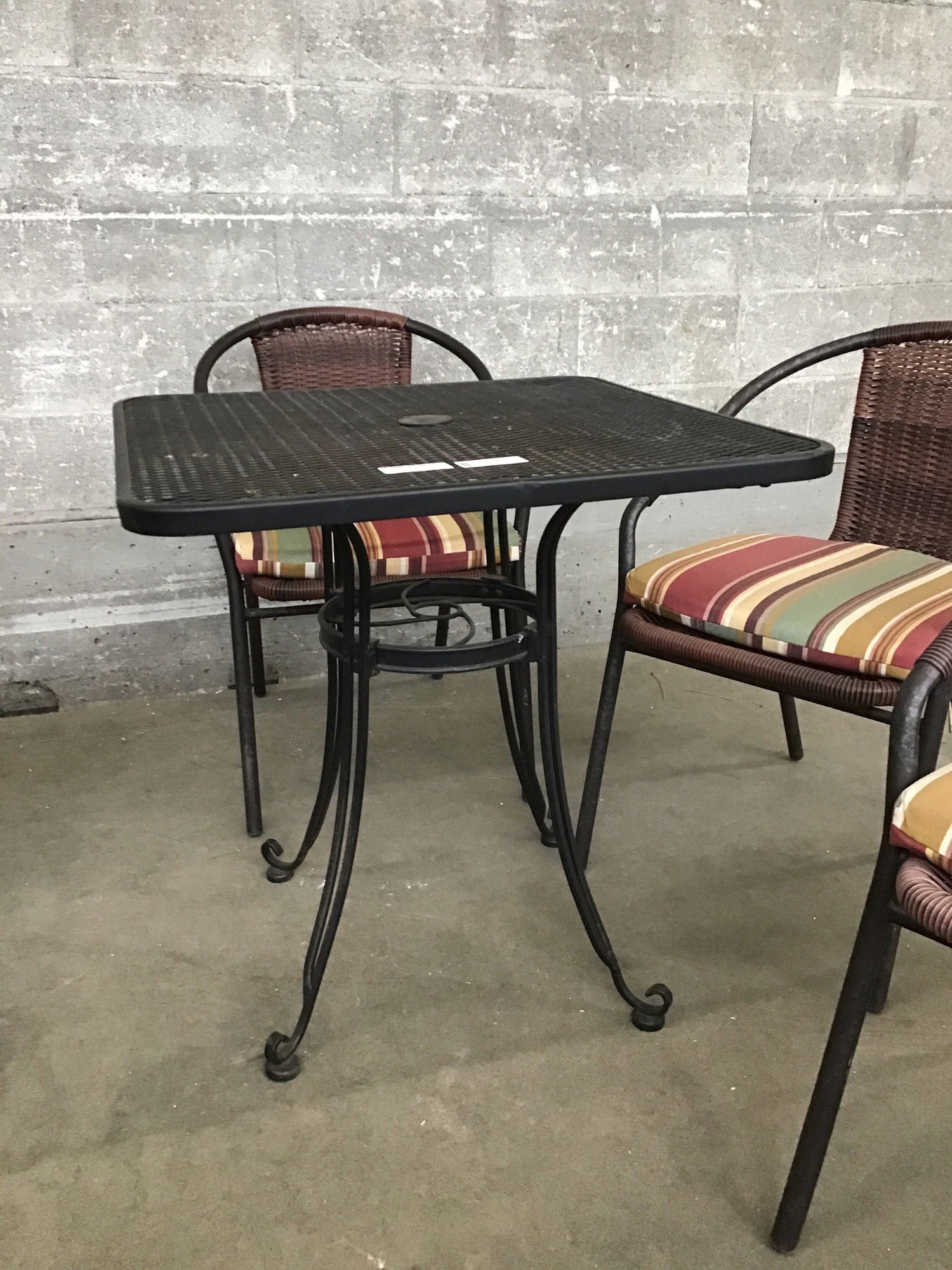 This is a set of patio chairs and table. The table is a classic black extruded steel style and the four chairs have a woven rattan back splat and cushions.