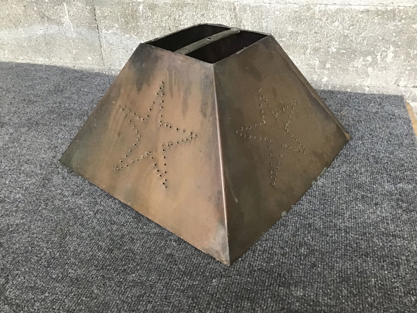This is a trapezoidal prism shaped light shade that has a faux copper finish but the shade is made of steel. The perforations create a star shape on each side.