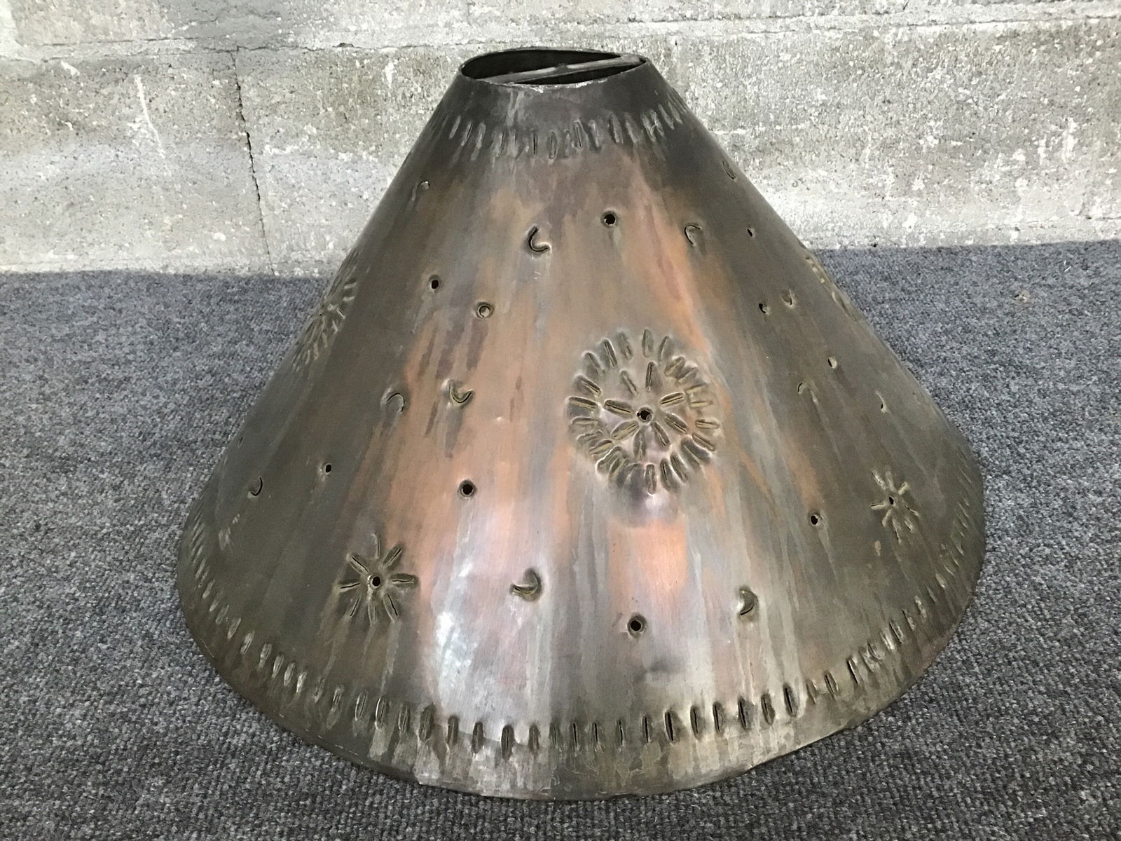This is a conical shaped light shade that has a faux copper finish but the shade is made of steel. The perforations create cute sunburst patterns.