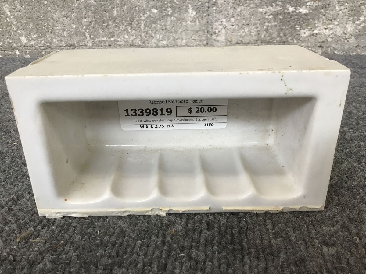 Tile in white porcelain soap alcove/holder. It's been used, but is mostly free of mortar and ready to reinstall.