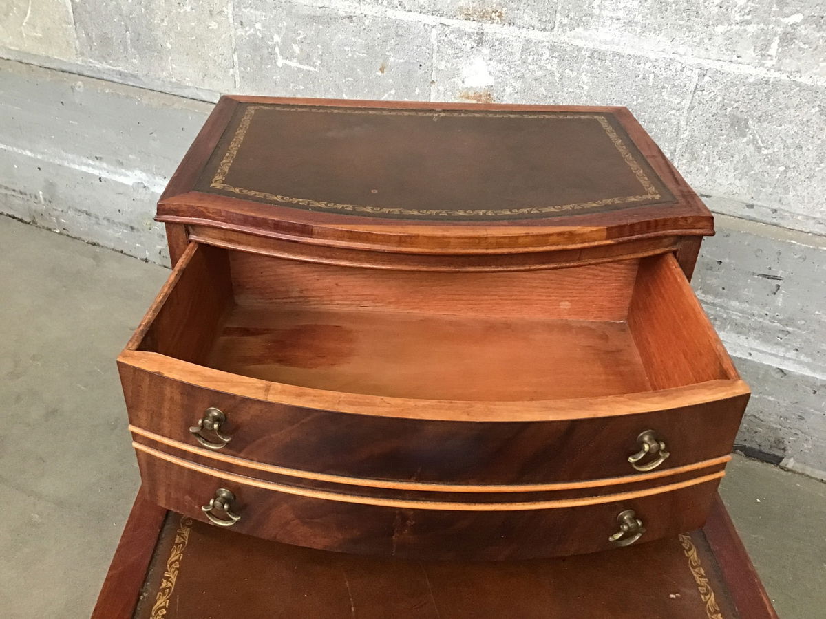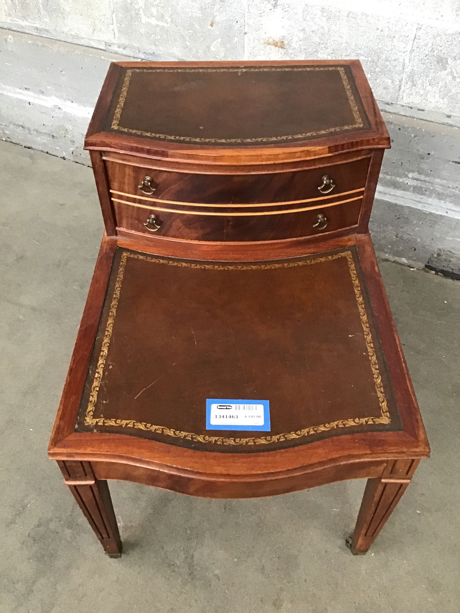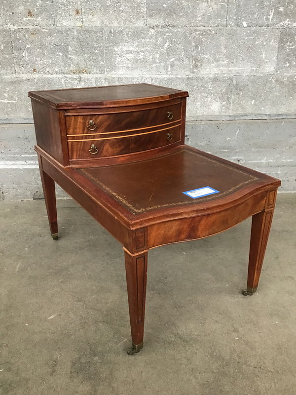 This is a Regency style tiered side table with leather tops that have gold tooling. Features mahogany construction and vintage D-ring pulls. Rolls on 4 casters.