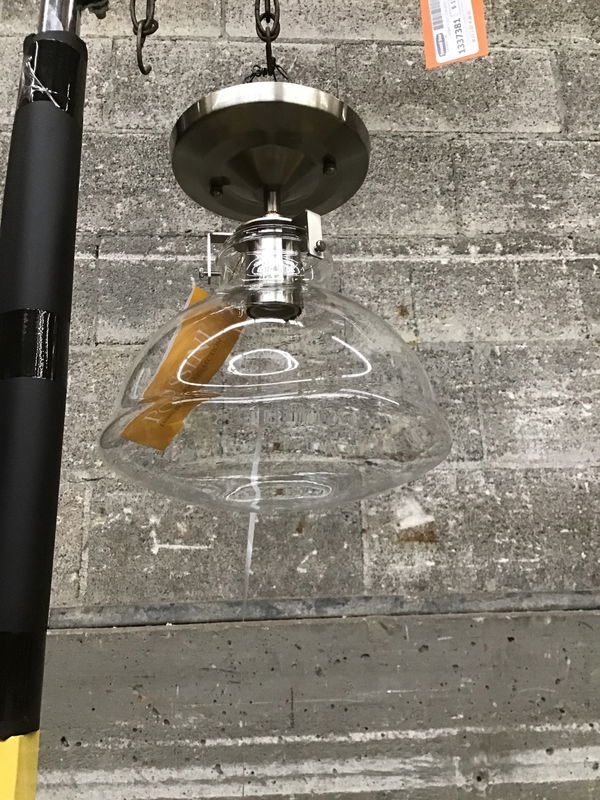 A cute little light fixture with a rustic farmhouse charm, with a satin nickel finish and a cute clear glass fitter similar in shape to a schoolhouse fitter. Manufactured by Possini for their Euro Design Bellis line.