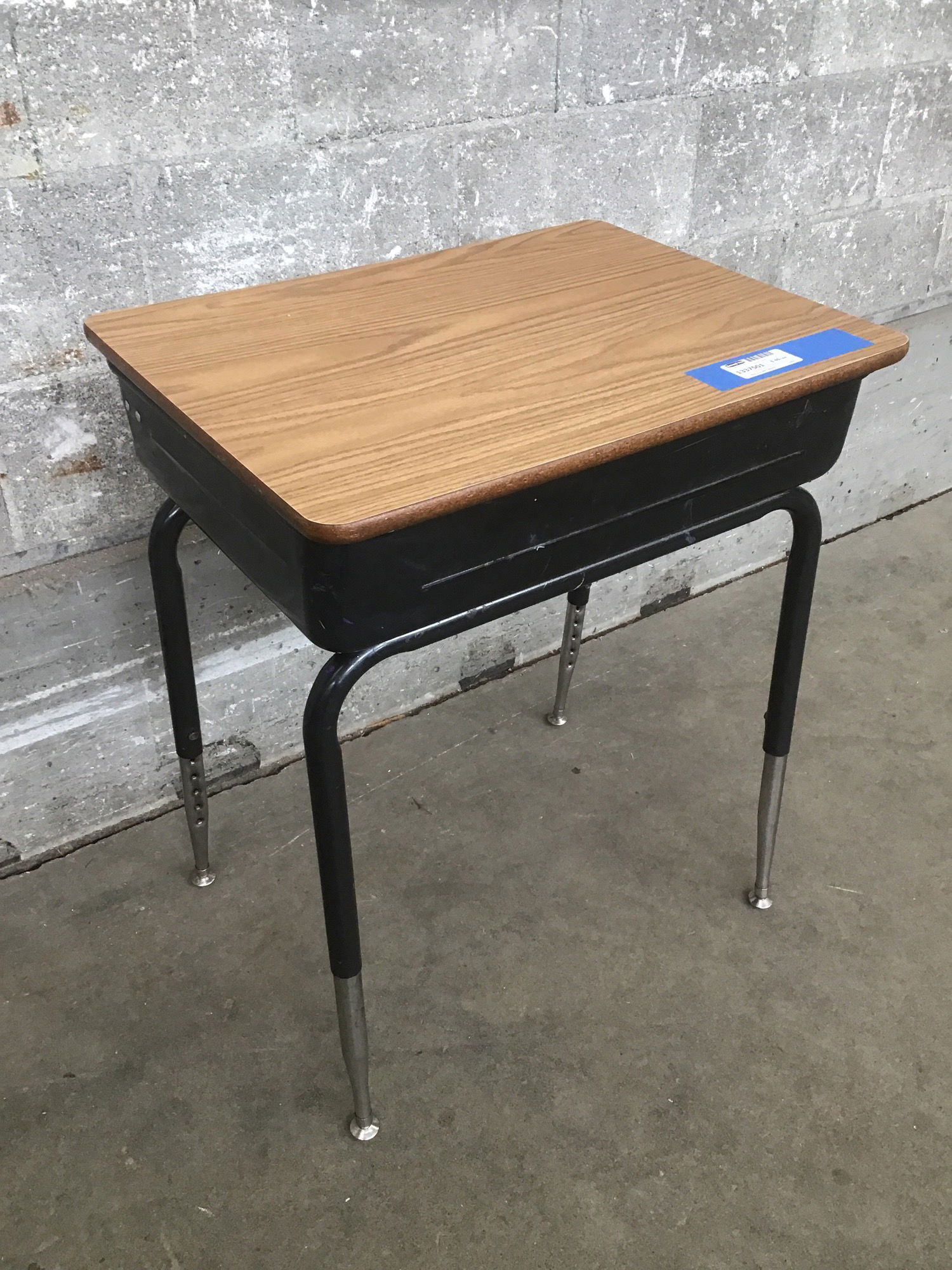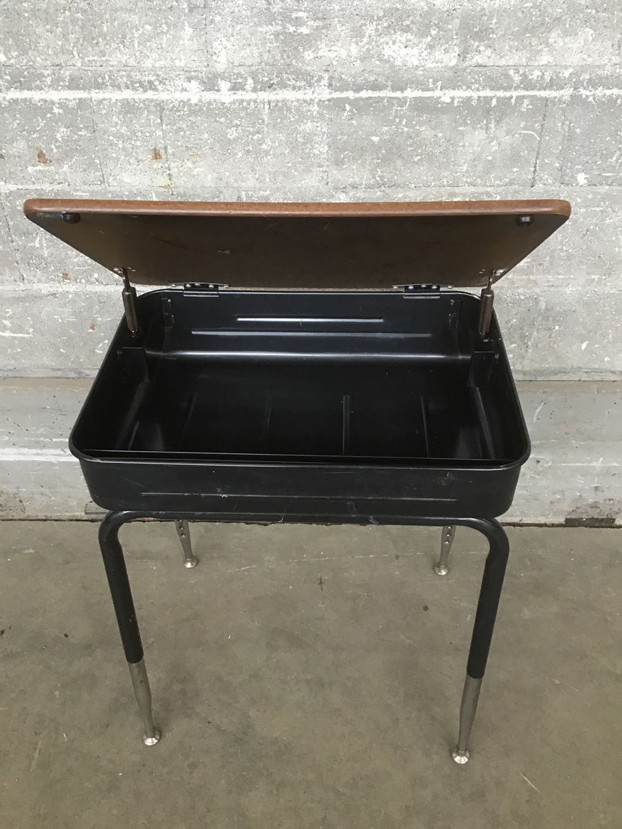 Metal, adjustable height school desk with laminate top that flips up to reveal interior storage.