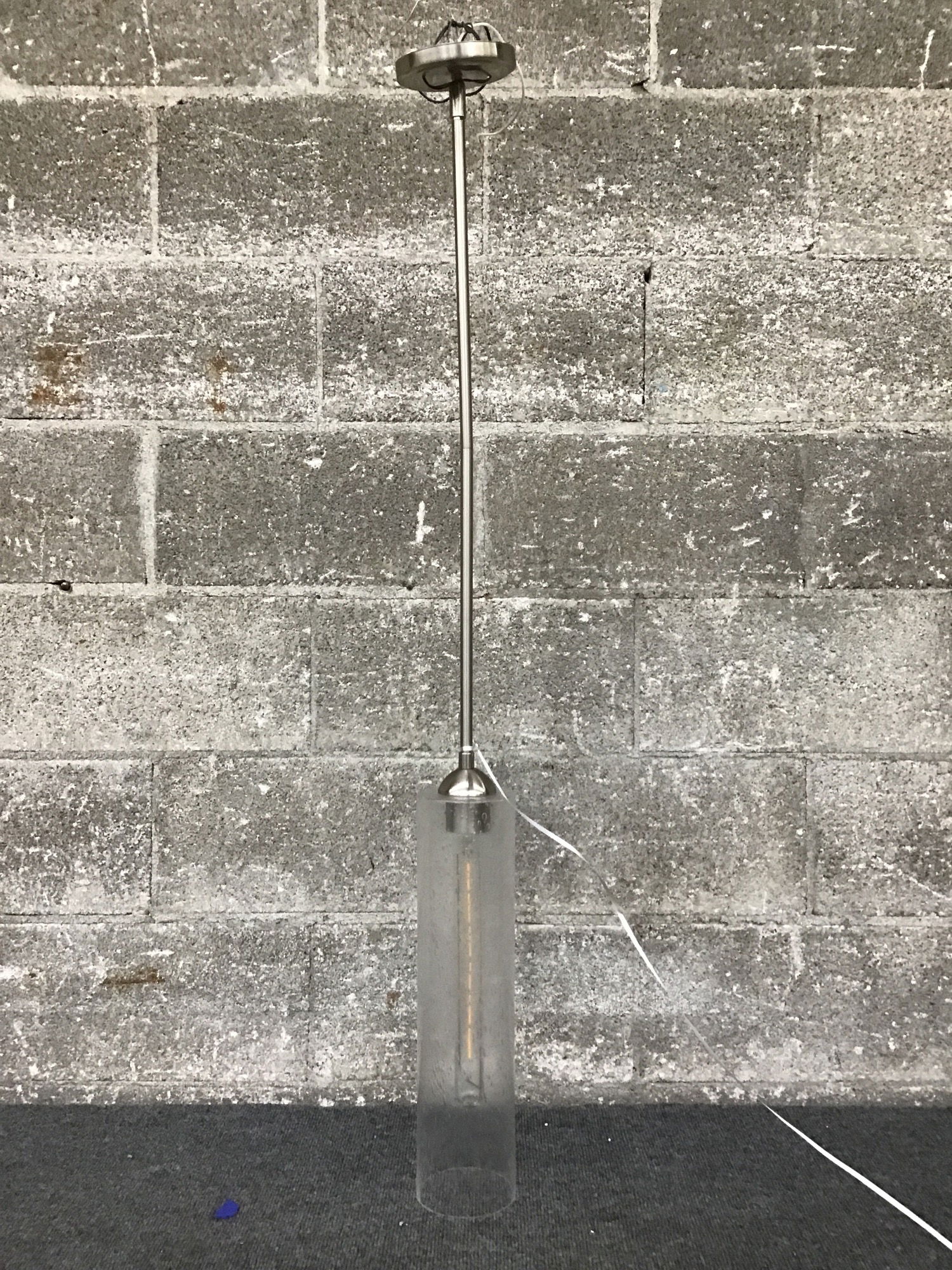 A pendant with a rigid line finished in brushed nickel with one long bulb and a clear seed glass fitter around it.