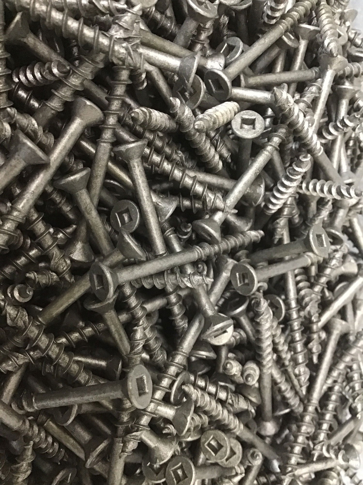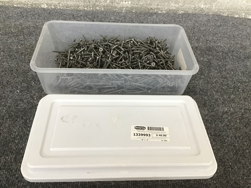 A large containter of self drilling and self countersinking exterior grade screws. #2 square style, size 8x2" and looks to be anywere between 500-1000 screws in total.
