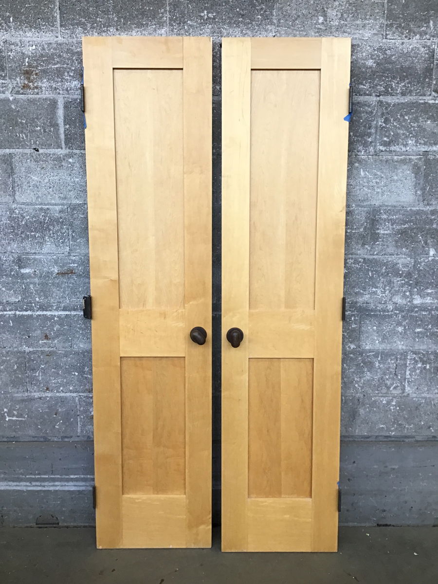 Custom shaker Maple double door set with unique cast brass dummy knobs. Each door has a friction catch at the top and antiqued brass hinges. Sold as a pair. Needs a new jamb.