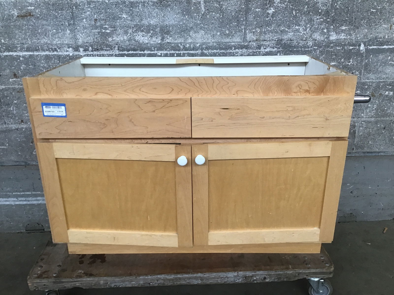 Clear finished, Shaker style maple vanity sink base. Right side is finished. Left is not. Price reflects doors will need some alignment work. Has a 5/8" wide spacer attached to left edge of face.