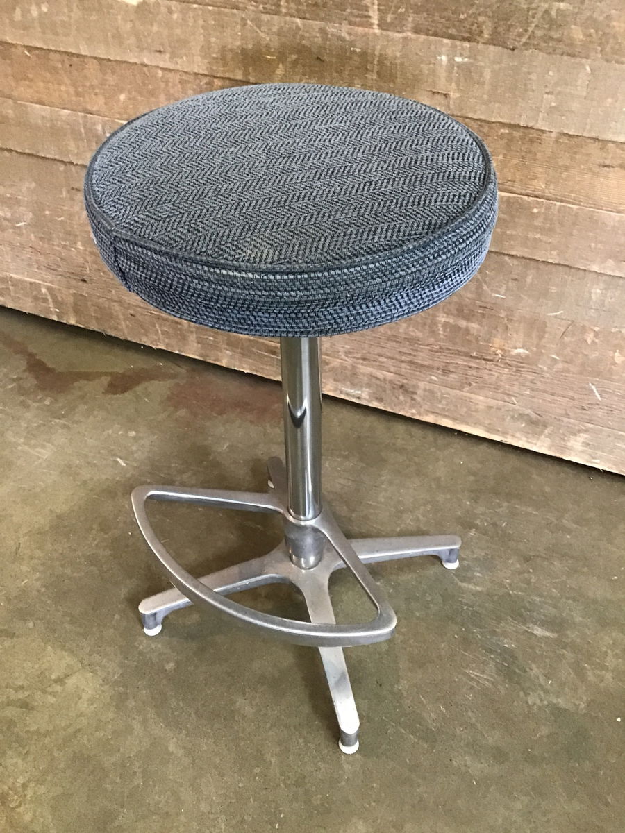 Nice shop or bar stool with a steel base and aluminum foot rest. The height is fixed, but the foot rest is adjustable. In overall great condition. Seat has been reupholstered, and can be left as is, or replaced with a seat that better suits your needs/style.