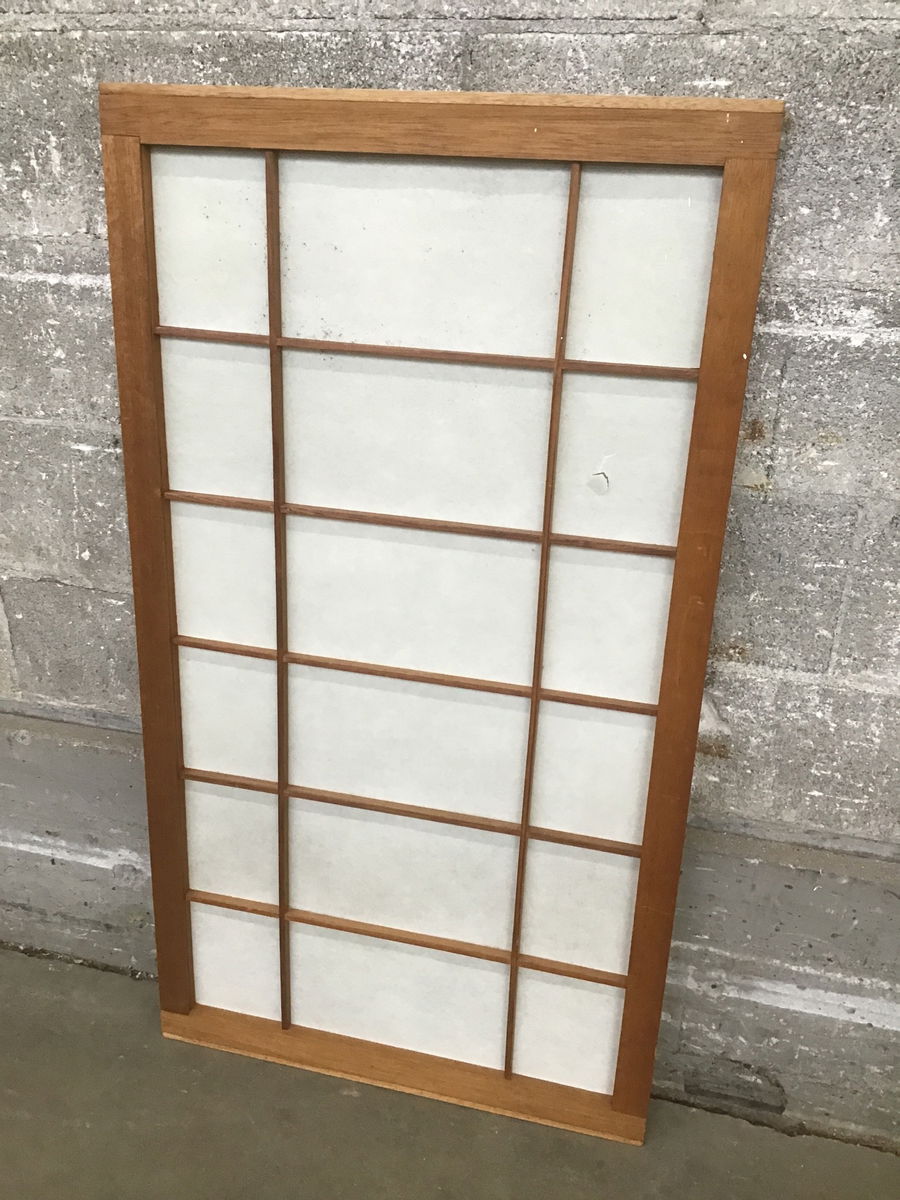 Sliding shoji screen panel with a warm stained mahogany frame and 17-panel grid design. This one has a small hole in the screen, price reflects.