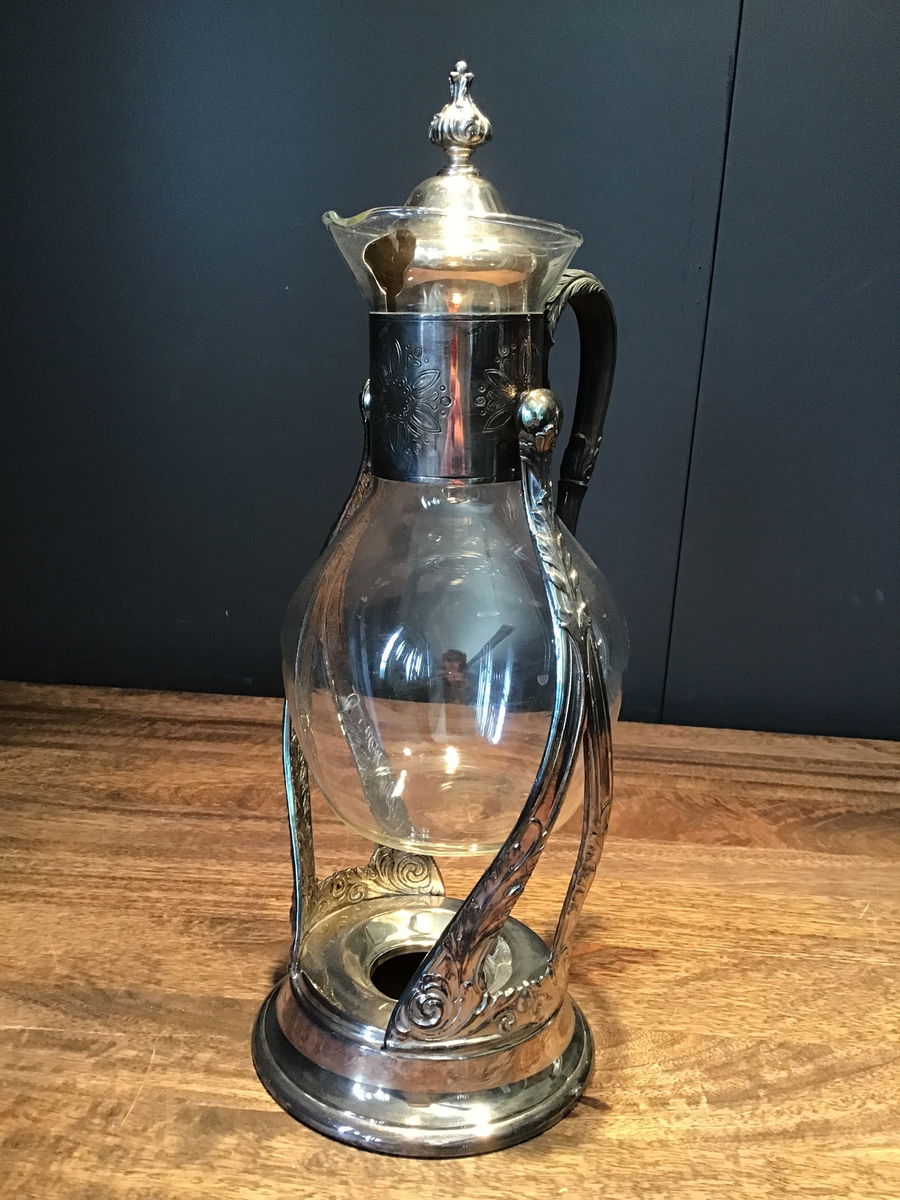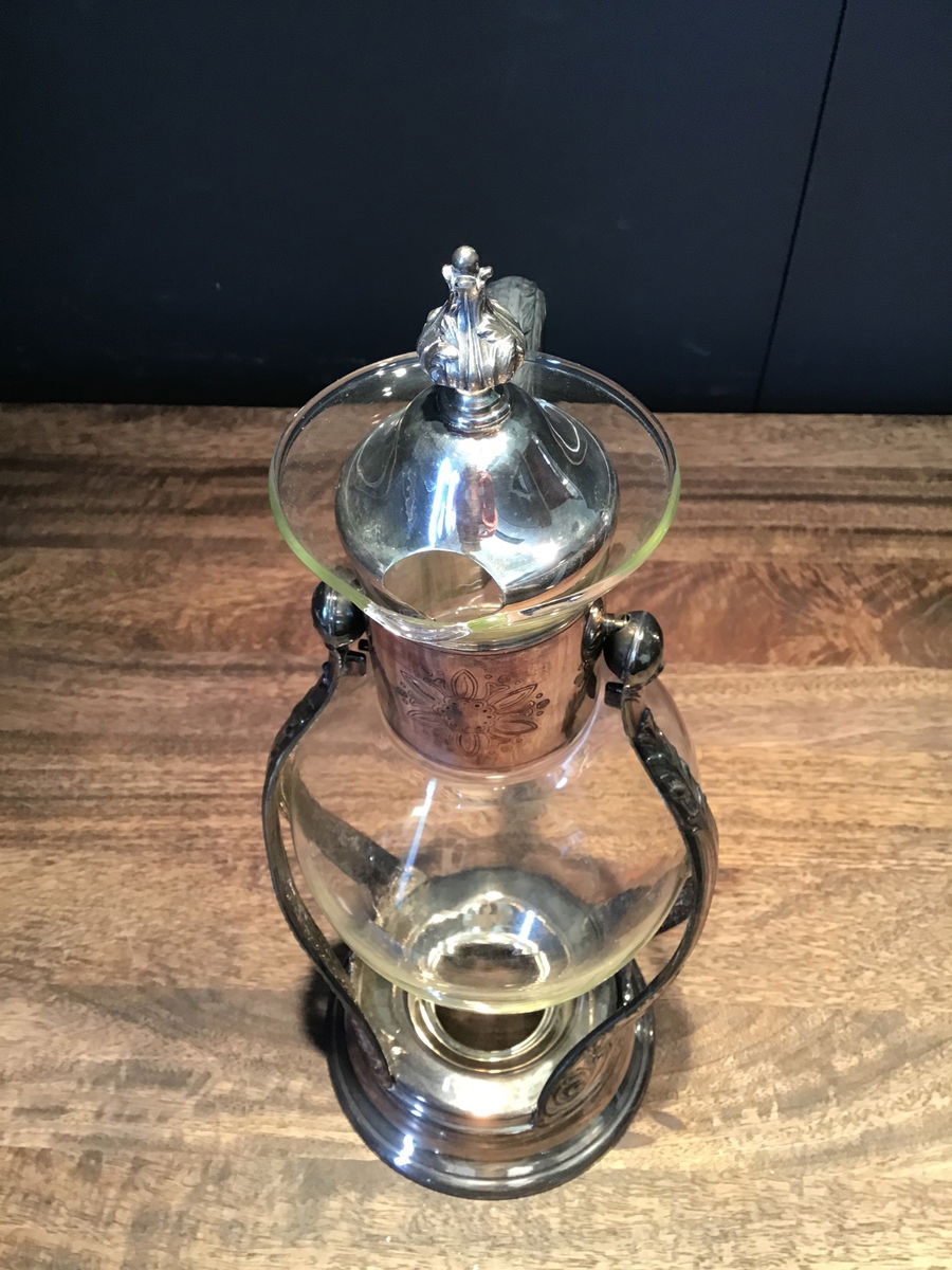 Pretty and ornate glass carafe with silver plated lid. Has a lovely silver plated covering with floral decor around the neck with a black handle. The real kicker is the silver plated stand for you to pour with ease, sits right in it! Glass is in great shape.