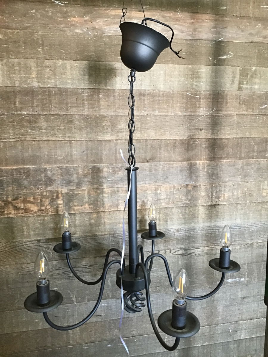 Simple and modern black chandelier in good, used condition. Has five arms that take small candelabra style bulbs. Wiring looks good, though we always recommend a full test prior to installation.
