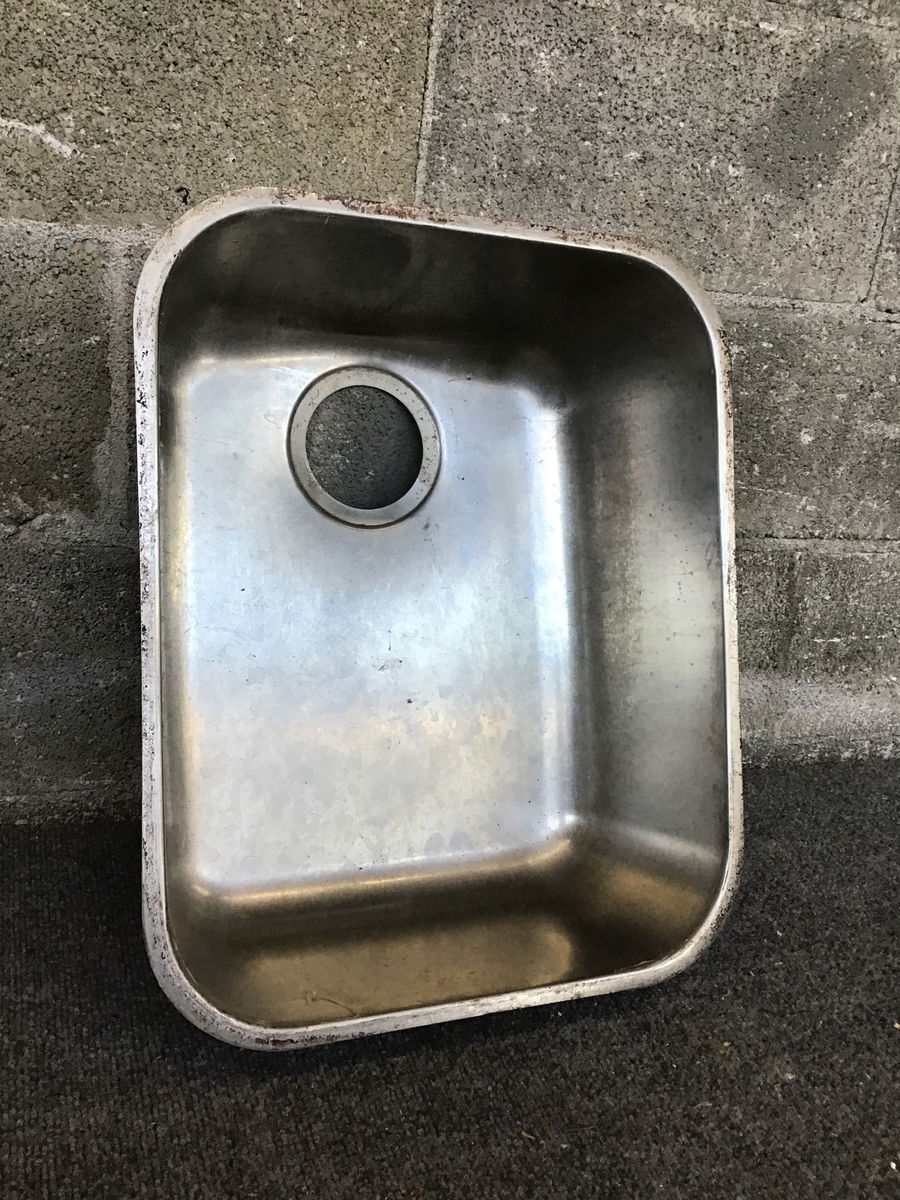 Smallish size undermount stainless steel kitchen prep or maybe bar sink, shows some surface wear