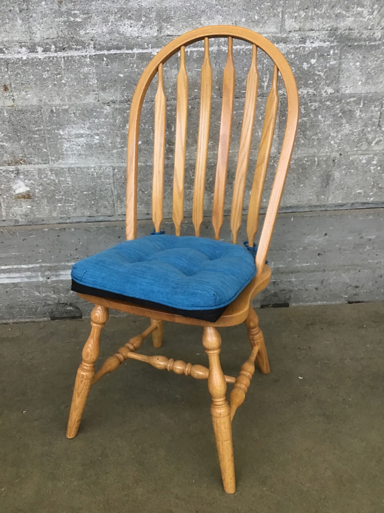 Solid Oak, blonde dining chair with a cute blue pad fer yer butt. Photo may be representational.