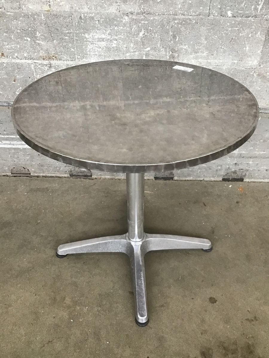 A stainless steel cafe table with a kinda pinwheel brushed finish. It feels strangely nostalgic- I'm thrown back to 2005, waiting to go and see a Star War, Britney's on the radio, and life is good. For just a small fee, you, too, can experience this nostalgia, too. There may be some light wear and tear, but nothing out of the realm of your own skills. Photos may be representative.