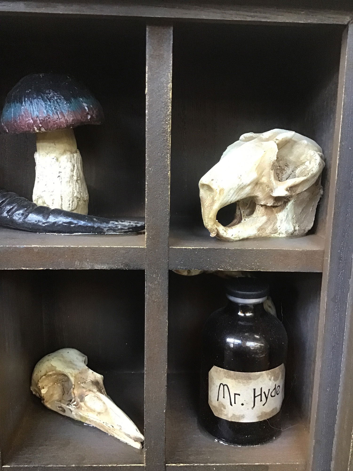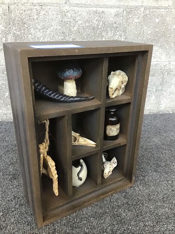 Finally, a display of bones and spooky snake filled eggs fit for a vegan! If you love this flavor of decor but don't love the idea of actual skeletons in your home, this wood and plastic curio display is the one for you.