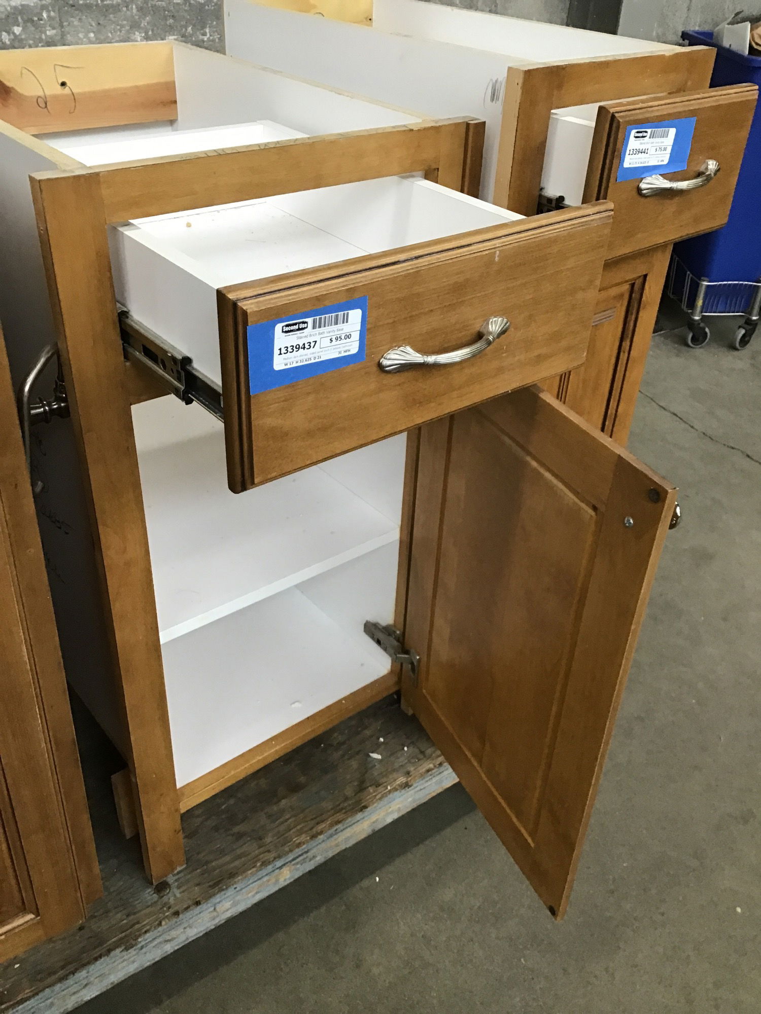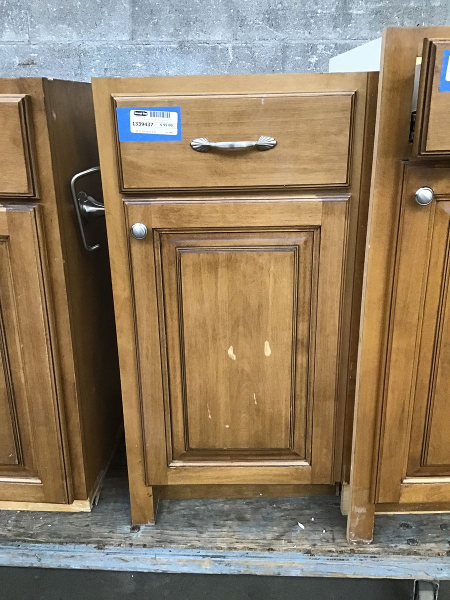 Medium dark stained, raised panel birch (I believe) bathroom base cabinet.