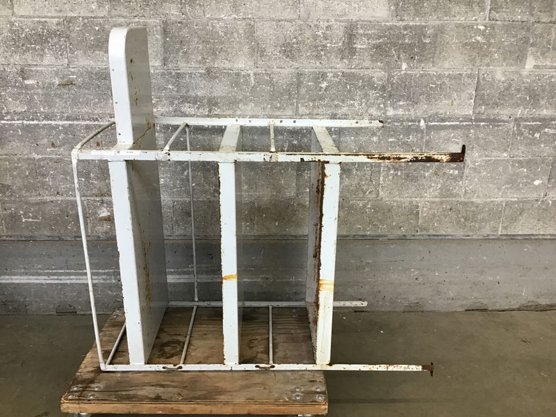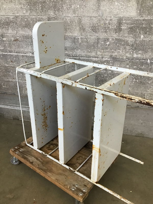 Hearty steel cart (photo'd on its side) with tons of potential but the base needs some modification to stand evenly (currently the legs are uneven) and maybe you slap some casters on there?