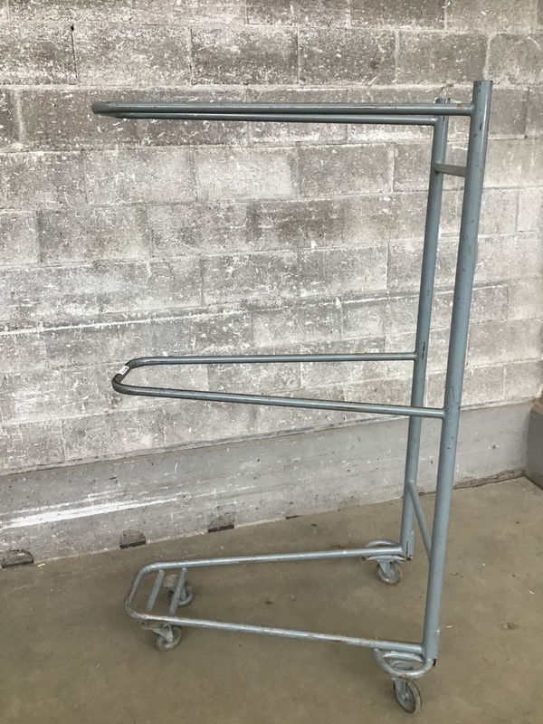 This is a steel frame rolling rack with two "U" shaped racks that I am guessing was used for either garments or possibly folding chairs. Whatever its former purpose was, it doesn't matter! Use it however you'd like!