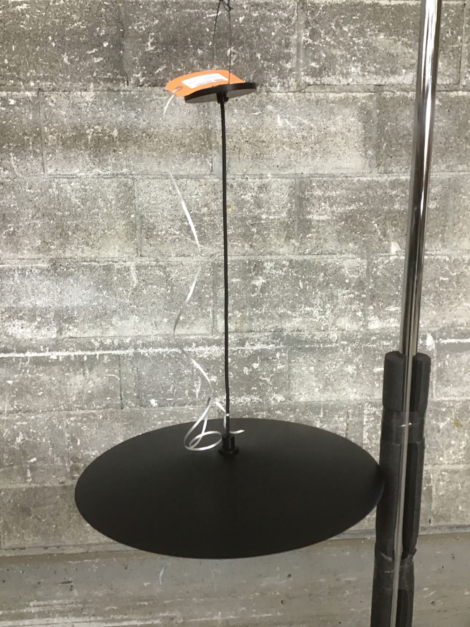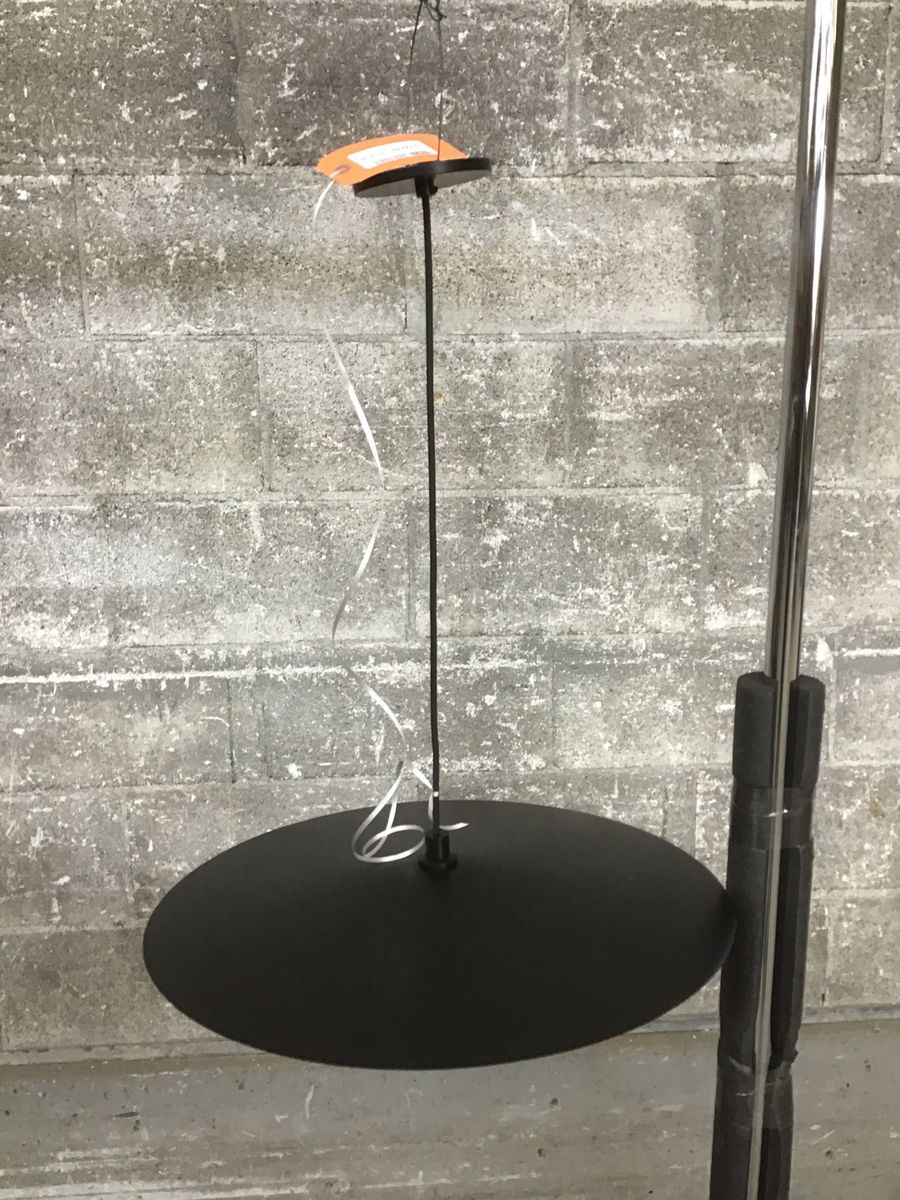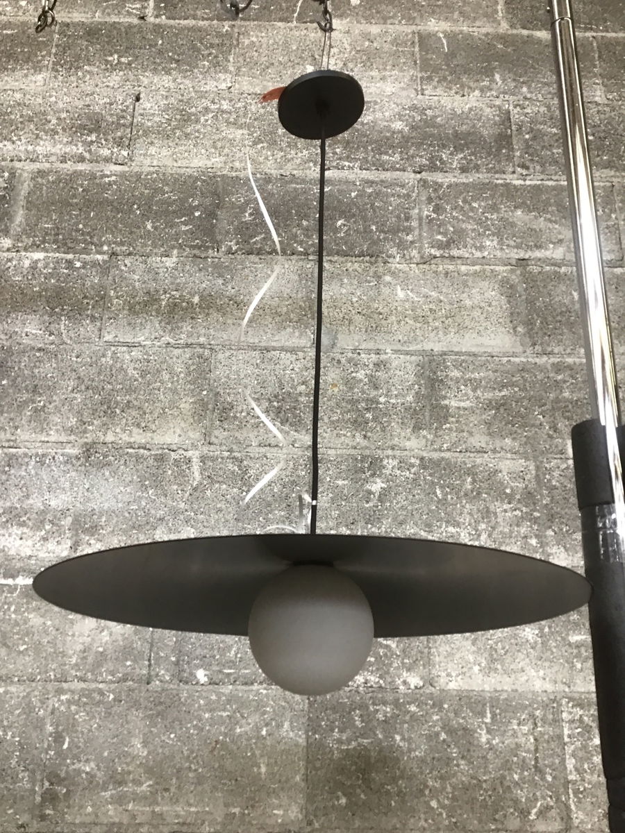 Modern pendant by Visual Comfort & Co. with a wide satin black steel shade and white glass bulb cover. Wiring and light are in good shape, undamaged and ready to re-install. Suitable for damp locations