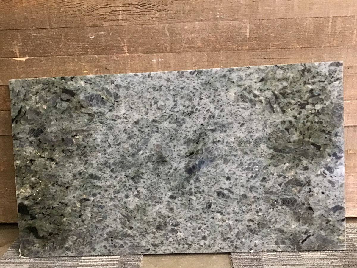 Gorgeous green-gray granite rectangle slab with strong pattern variation. Polished face and front edge. Great for a cabinet or a table top.