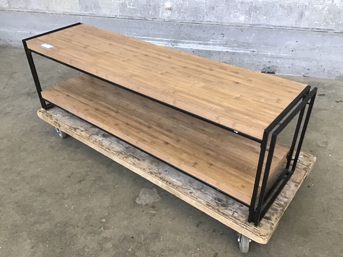 Pretty suave looking bench with a bamboo seat and lower shelf on a simple black steel frame.