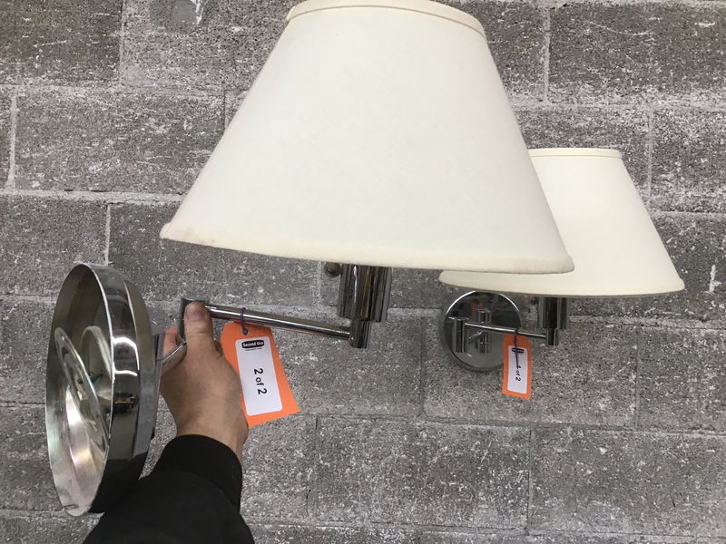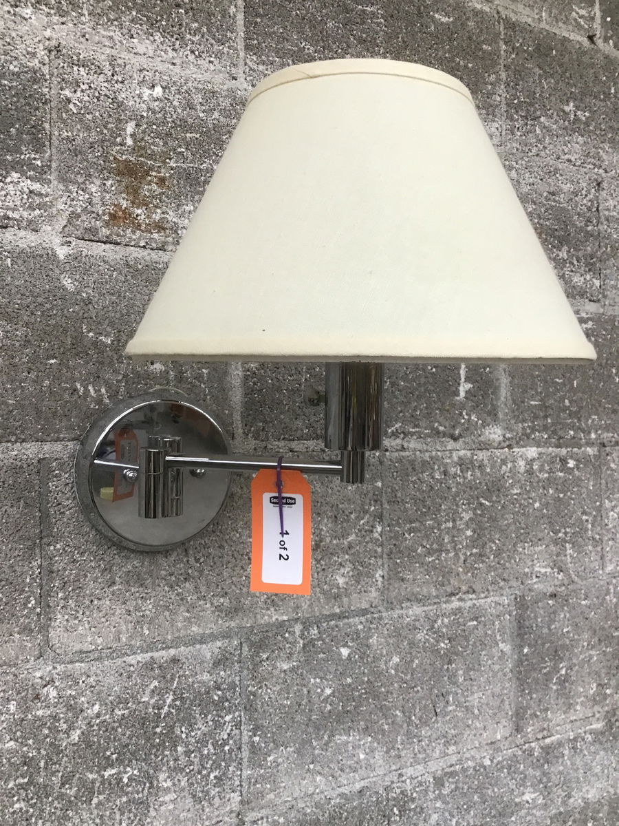 Pair of swing arm wall sconces with a polished chrome finish and linen shades. These would be great as bedside sconces or framing a sofa for a little extra reading light.