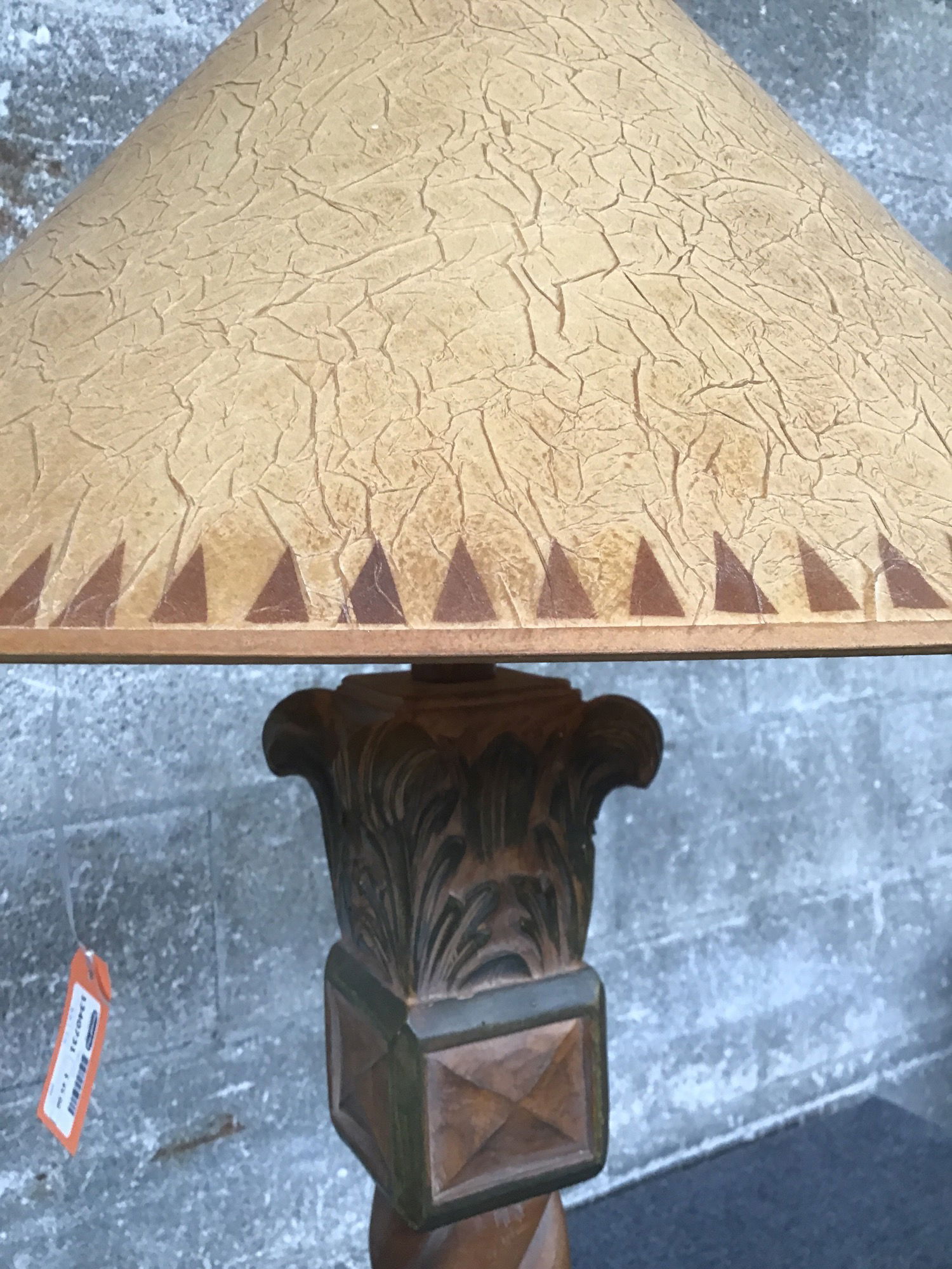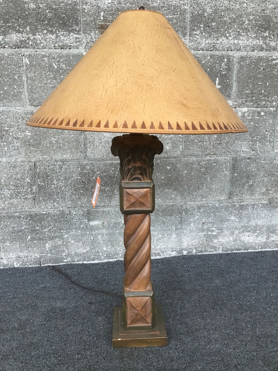 Nice looking table lamp with a carved wood body and crackle textured cloth shade.
