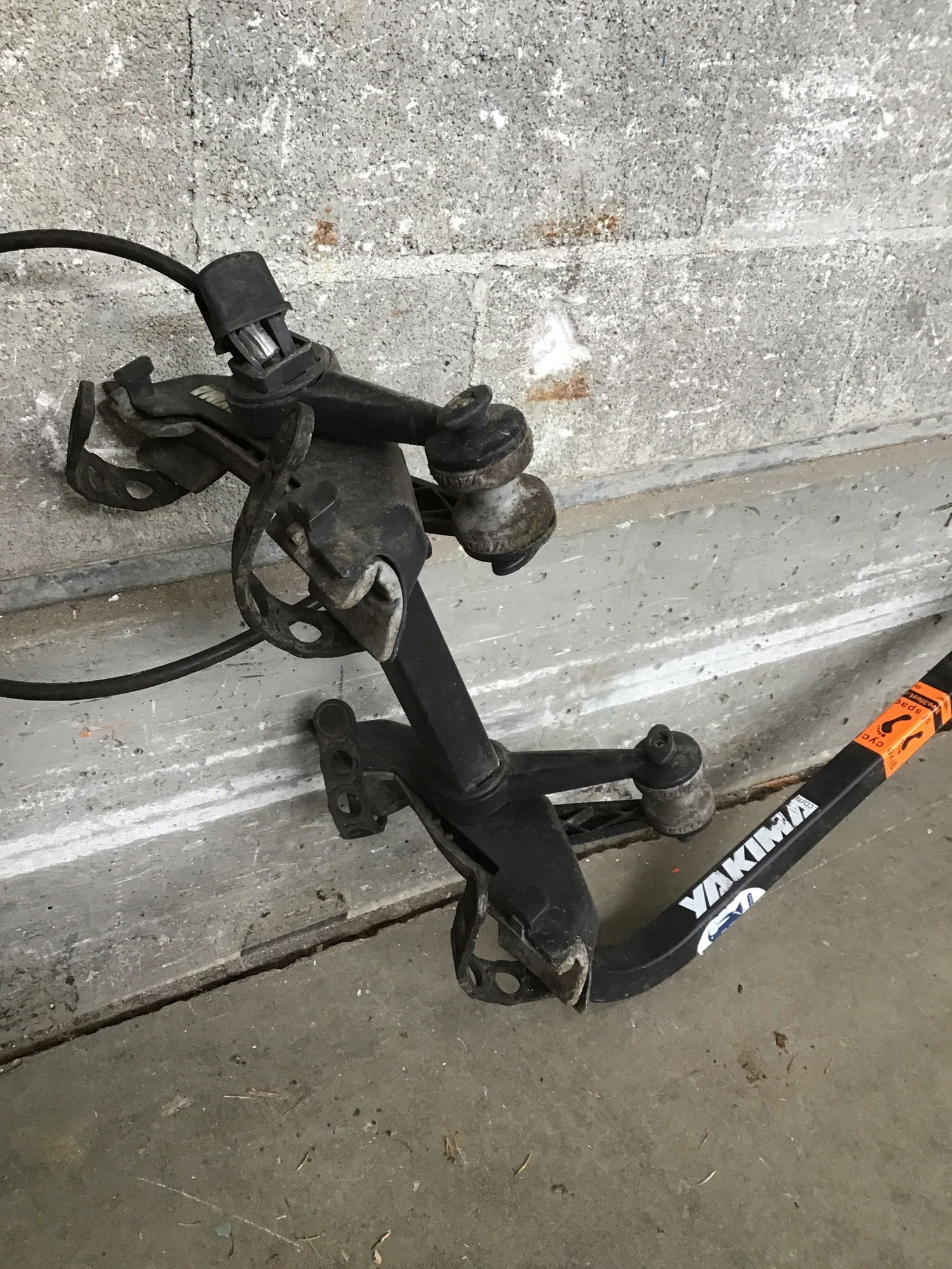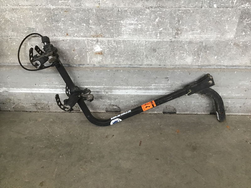 USE AT YOUR OWN RISK! Yakima brand trailer mount bike hitch, definitely needs a pin to attach to a hitch. Give it a good inspection before use.