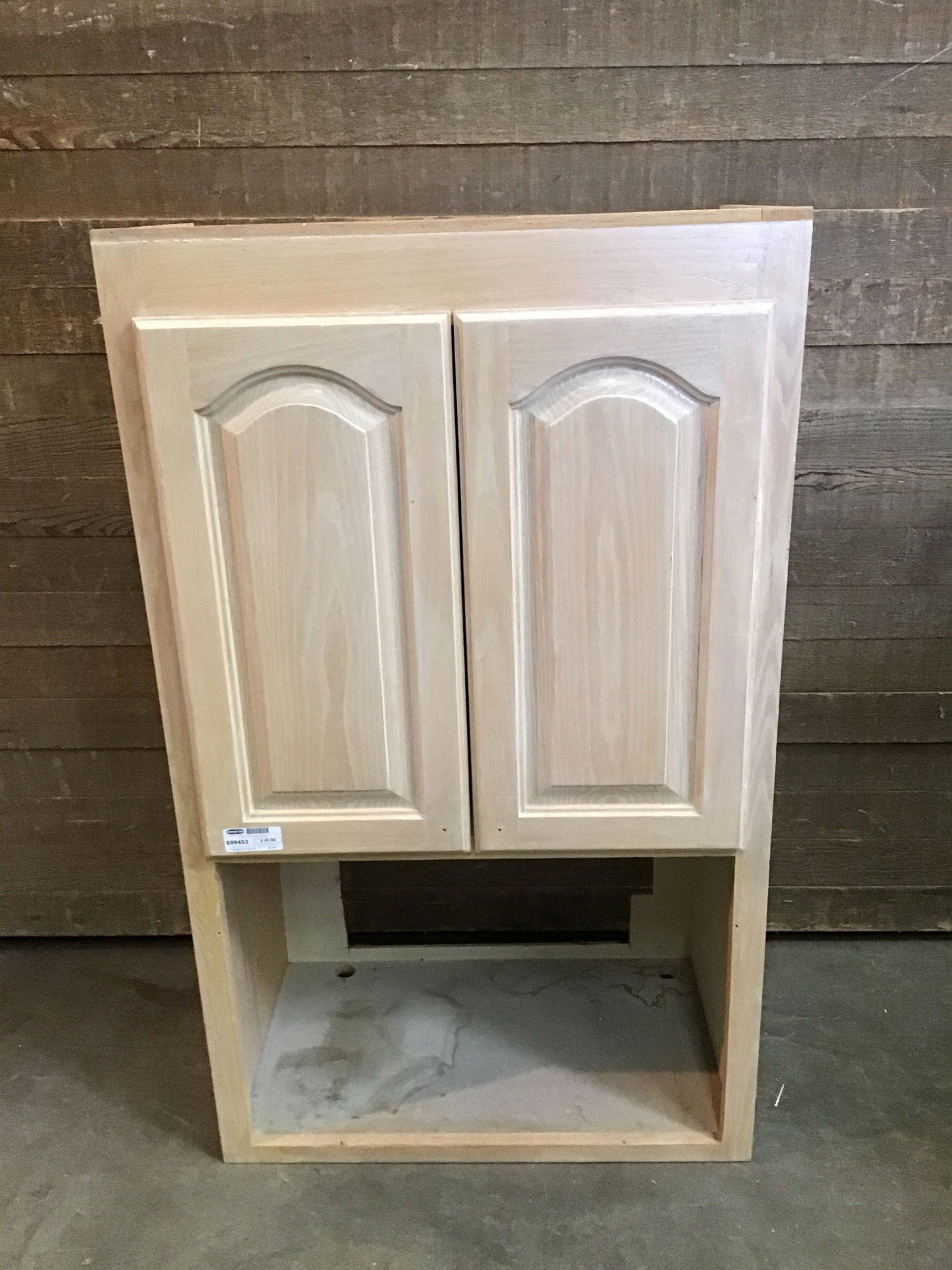 Upper microwave cabinet. Overall in fair shape with signs of use, priced accordingly. Will need door pulls.