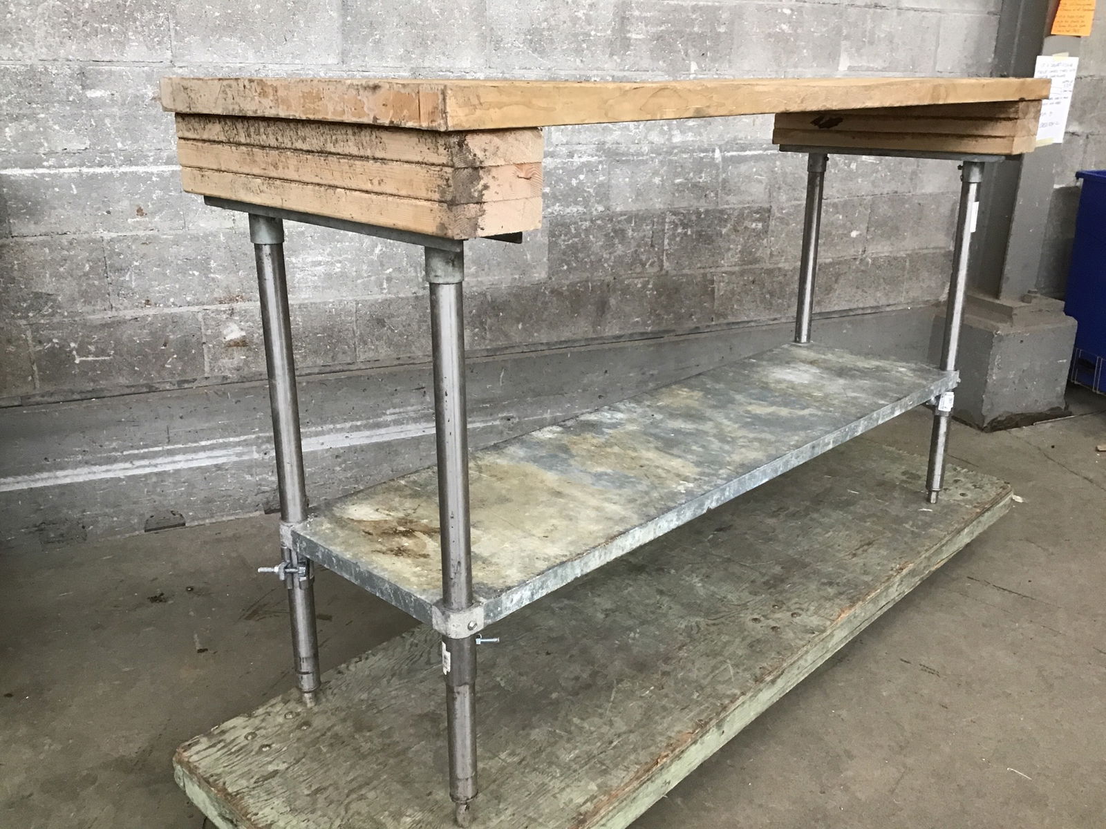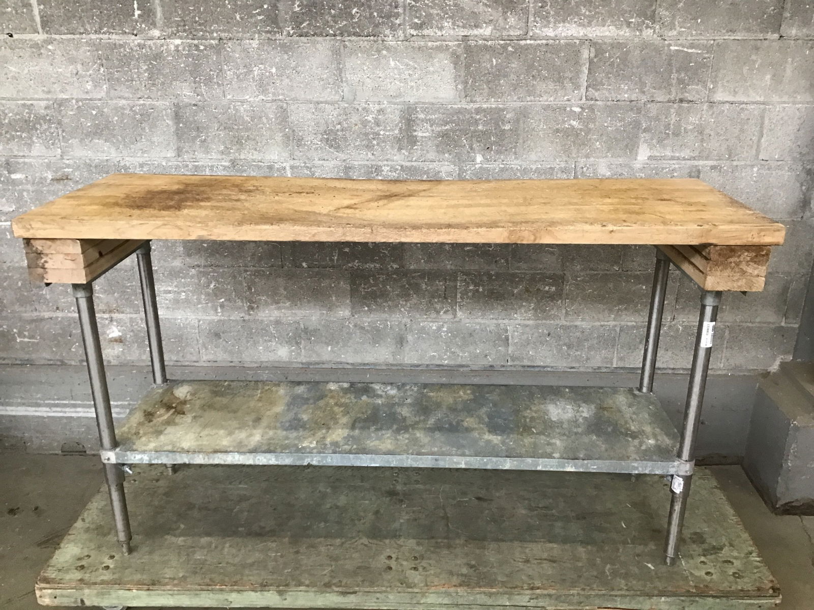 This work table should almost be in a baking museum or something, there is a significant crater worn into the solid Maple in the center of the table. Presumably this is where the dough got kneaded day in and out. Kind if awesome and the table STINKS. So, price reflects, maybe its just the beast of a table you were looking for? The base is dirty but structurally sound.