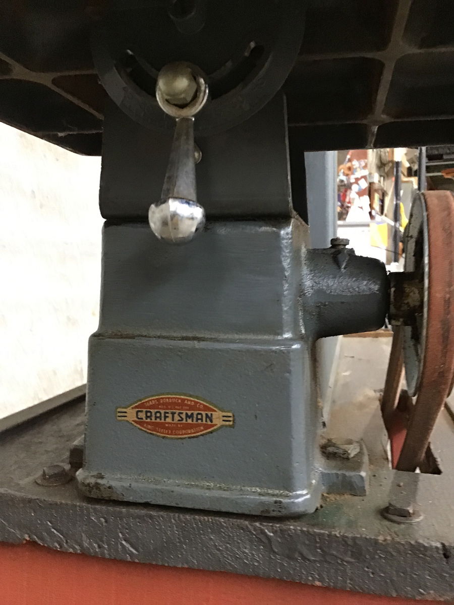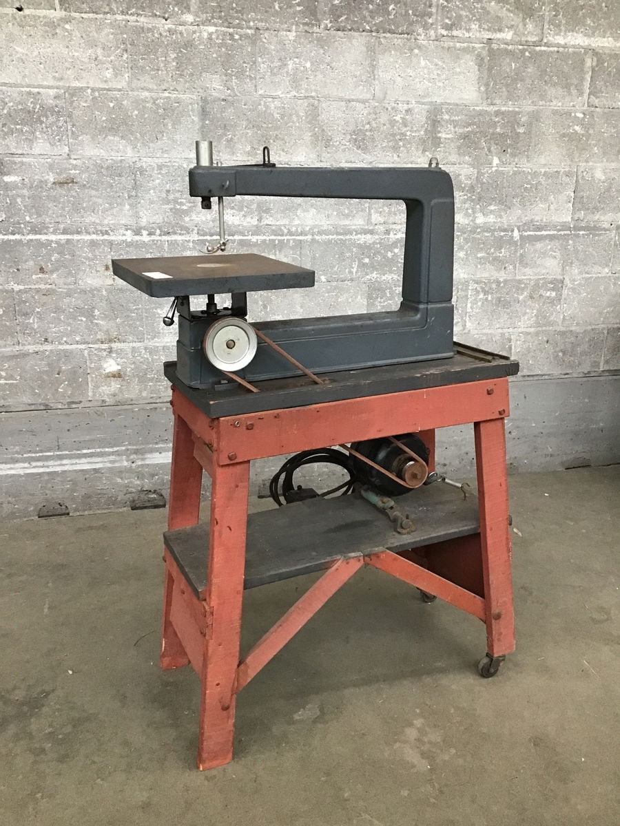 An older scroll saw that looks to be in good condition, manufactured by Sears & Roebuck (model 103.20720) that appears to be in good shape, mounted to a homemade stand that's got a couple of casters for easier movement. Needs a new blade and could probably use a new belt soon, too.