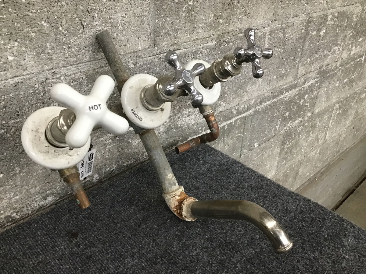 Vintage 3 hole tub filler/shower valve setup. In fair enough vintage condition, but probably best to use for parts or even a fun outdoor bath sitch! One of the handles is a mismatch. How quirky!
