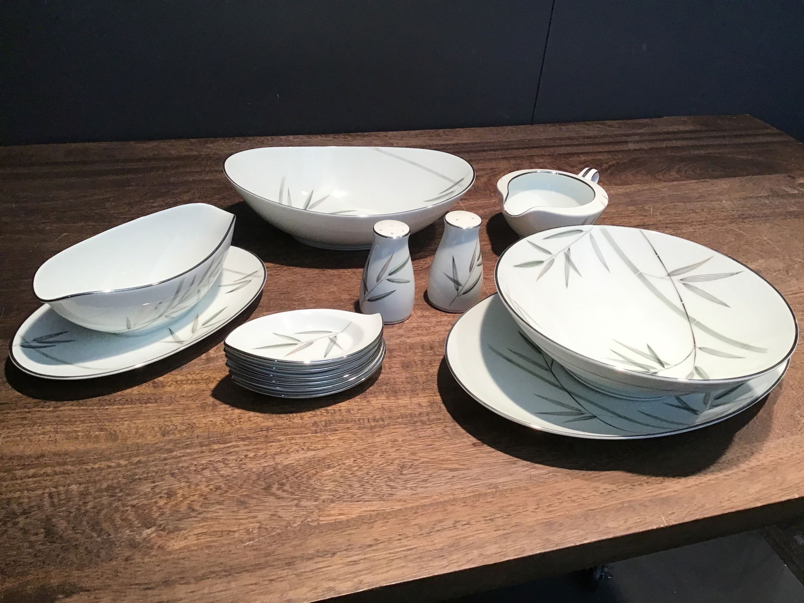 Perfectly pristine assorted China set from esteemed manufacturers Noritake. Handmade and vintage from Japan with a matching bamboo design on each piece. Includes 1 large bowl, 1 medium serving tray, salt and pepper shakers, 6 small spoon rests, 2 gravy boats, and one large serving bowl. Designer stamp on bottom of each piece.